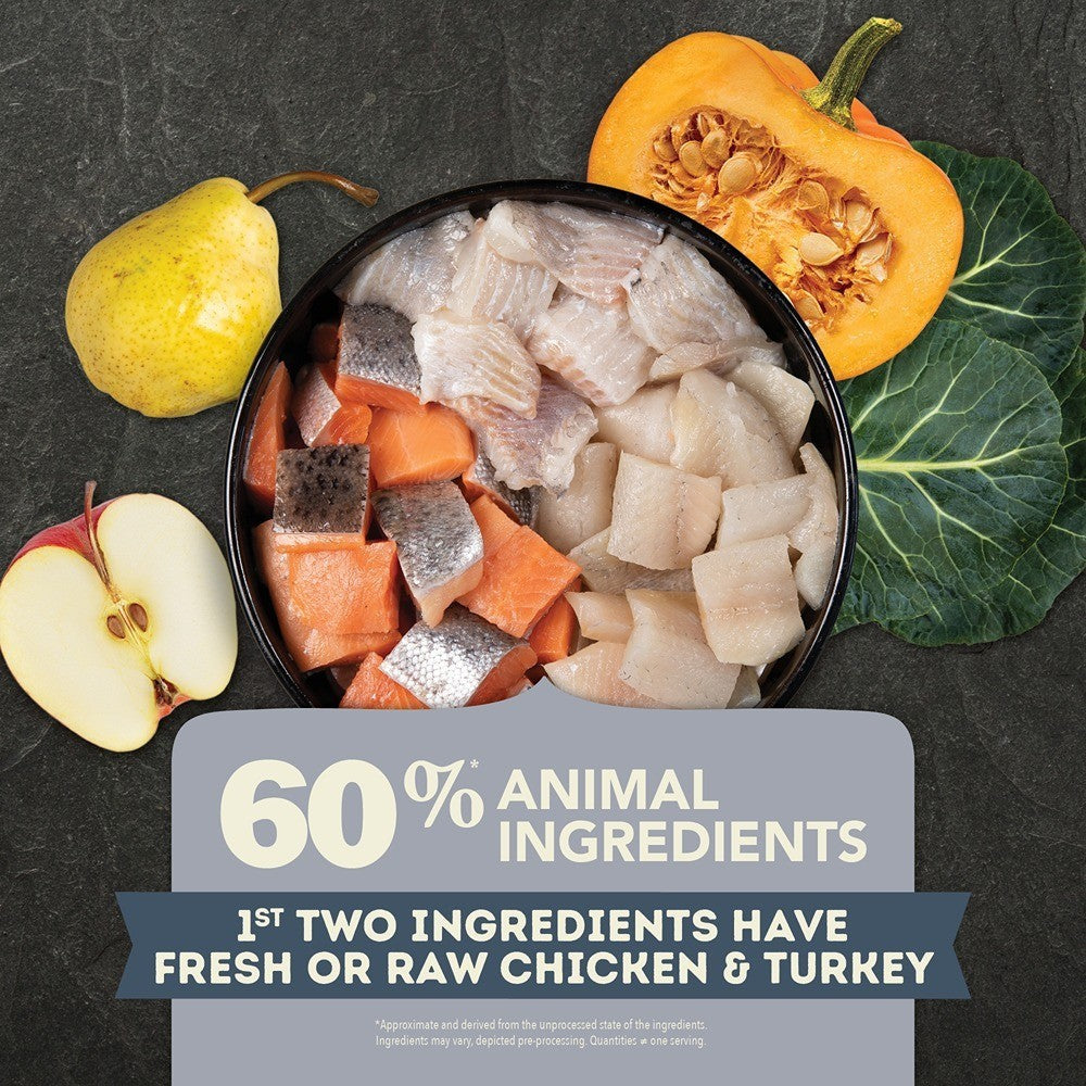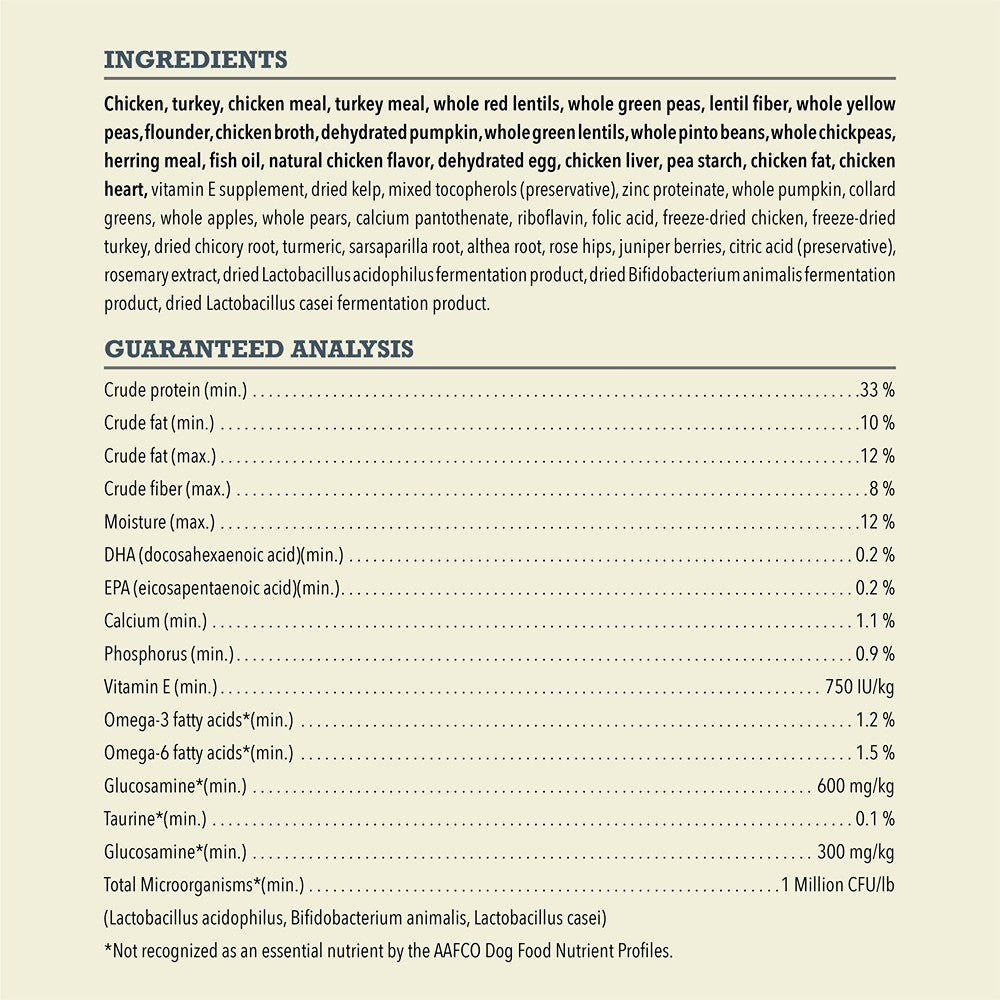 With 60% animal ingredients and 40% fruits and vegetables, this grain-free recipe delivers complete and balanced nutrition. Fibre from pumpkin and probiotics help support digestion, while omega fatty acids nurture skin and coat health. Essential vitamins and minerals provide strength for bones and muscles, while the carefully balanced formula helps dogs prone to weight gain stay in peak condition. Coated with freeze-dried chicken and turkey liver, it’s both nutritious and delicious. Suitable for adult dogs of all breeds, this recipe is ideal for supporting healthy weight, digestion, and everyday vitality. Not recommended for puppies, seniors with special needs, or dogs requiring weight gain.