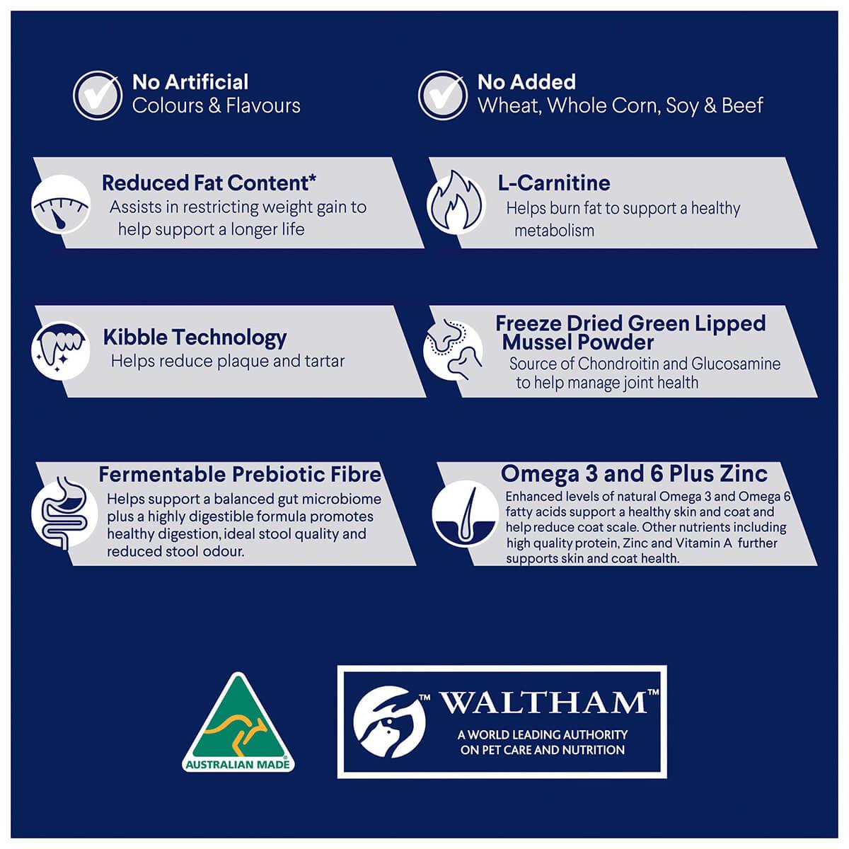 This dog food is specifically formulated for adult dogs who are overweight. This dog food provides the right amount of nutrients your dog needs without the extra calories. This dog food contains chicken as the primary source of protein. It also has prebiotics for healthy digestive system, vitamin E for stronger immune system, and zinc and linoleic acid for healthy skin and coat.