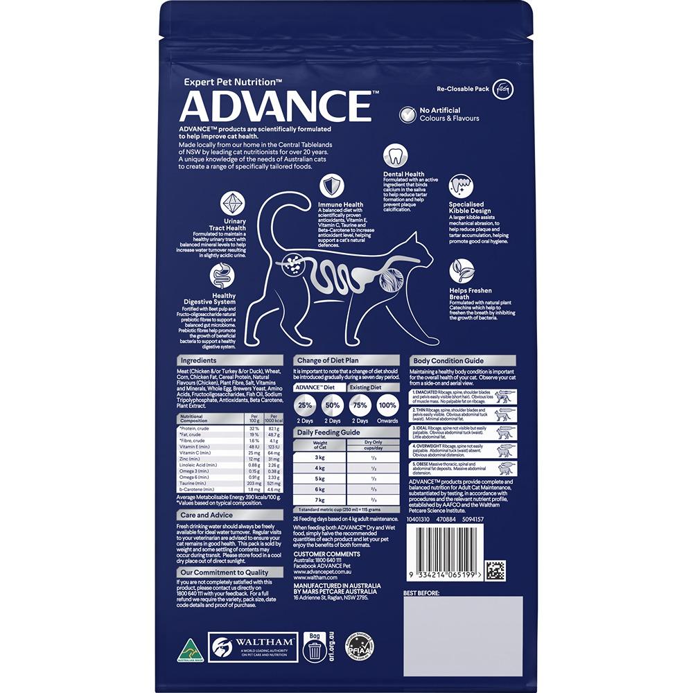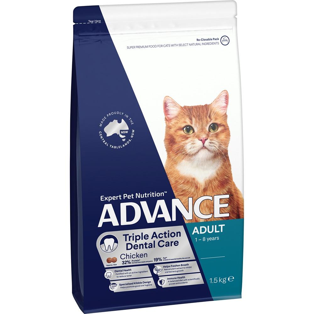 Advance Triple Action Dental Care Adult Dry Cat Food. Bursting with natural plant extracts, tartar reduction formulas, and research-backed kibble technology, your furry friend will love their new and improved dental health. Think: less plaque, lower levels of bacteria and fresher breath.