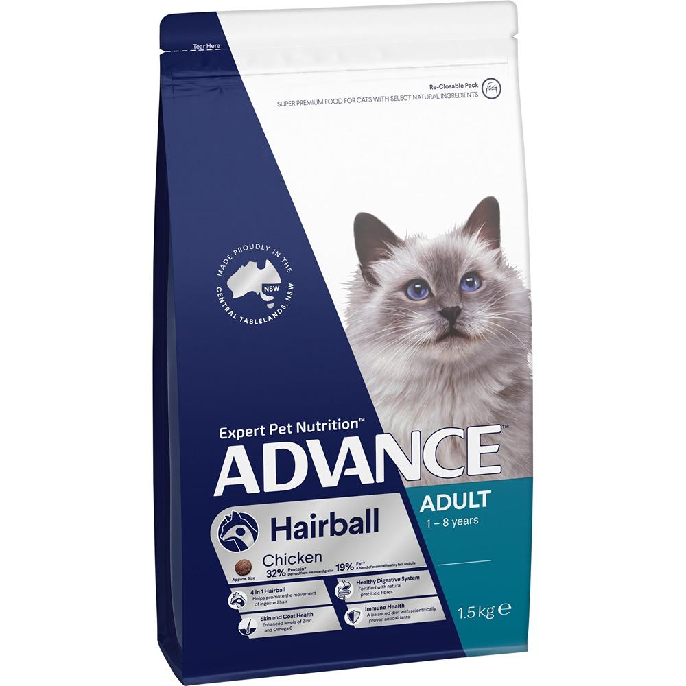 Advance Hairball Adult Dry Cat Food. Does your adult cat have a hairball problem? You've come to the right place. Evidence-backed natural ingredients like fibre, psyllium husk, cellulose and slippery elm bark work together to support the movement of ingested hair, meaning less hairballs to clean up.