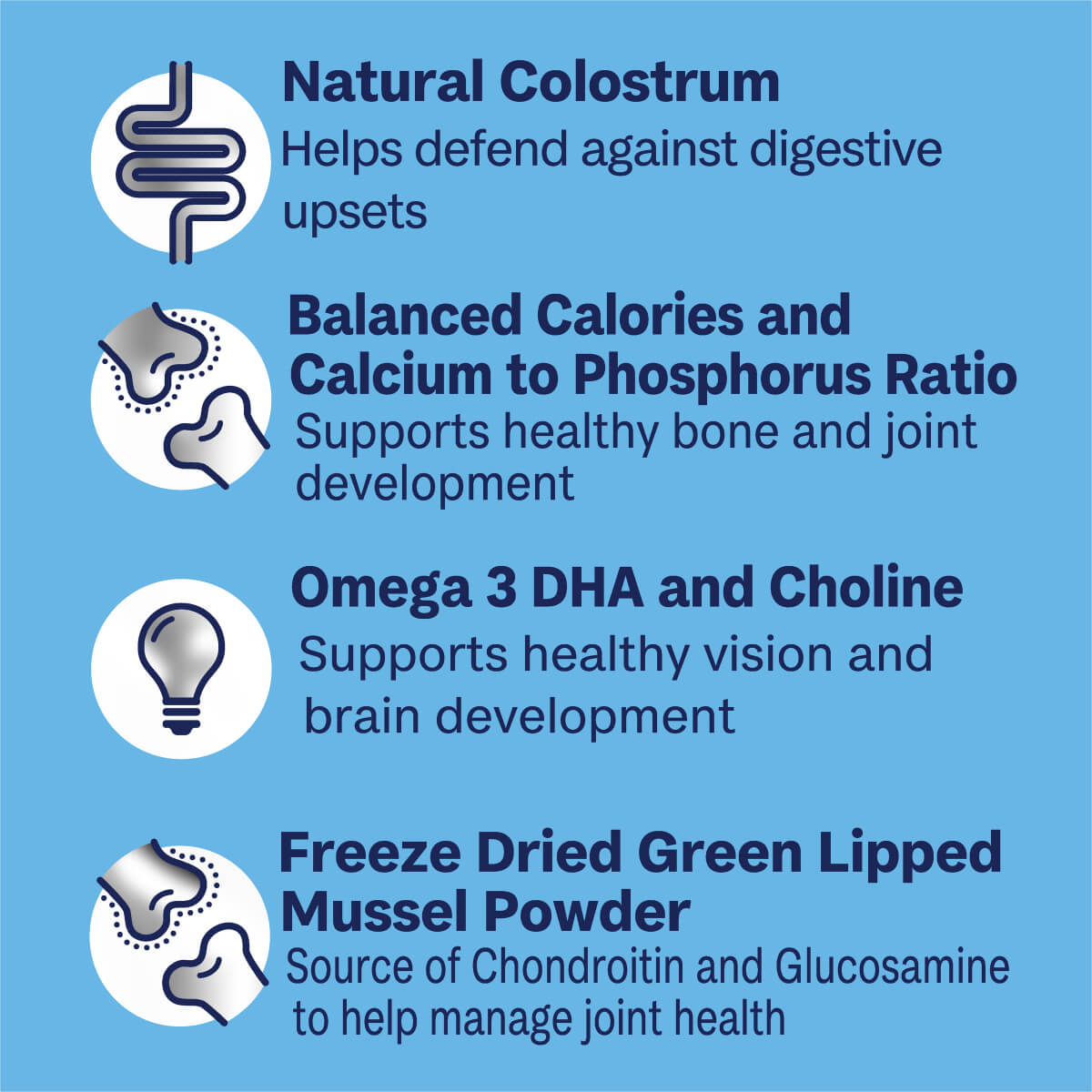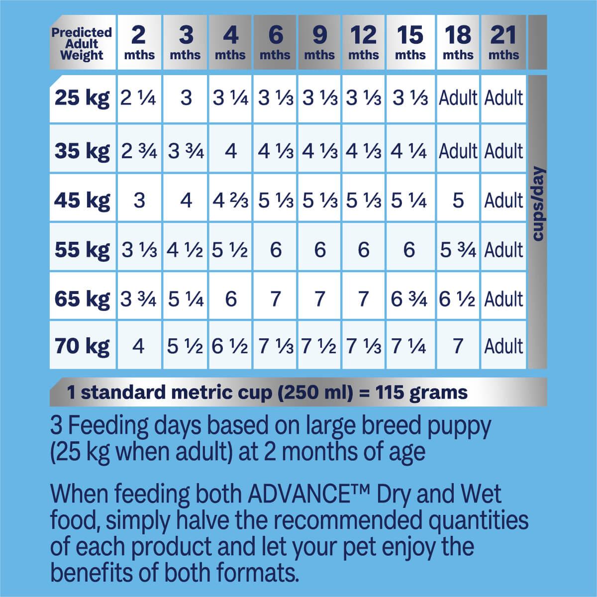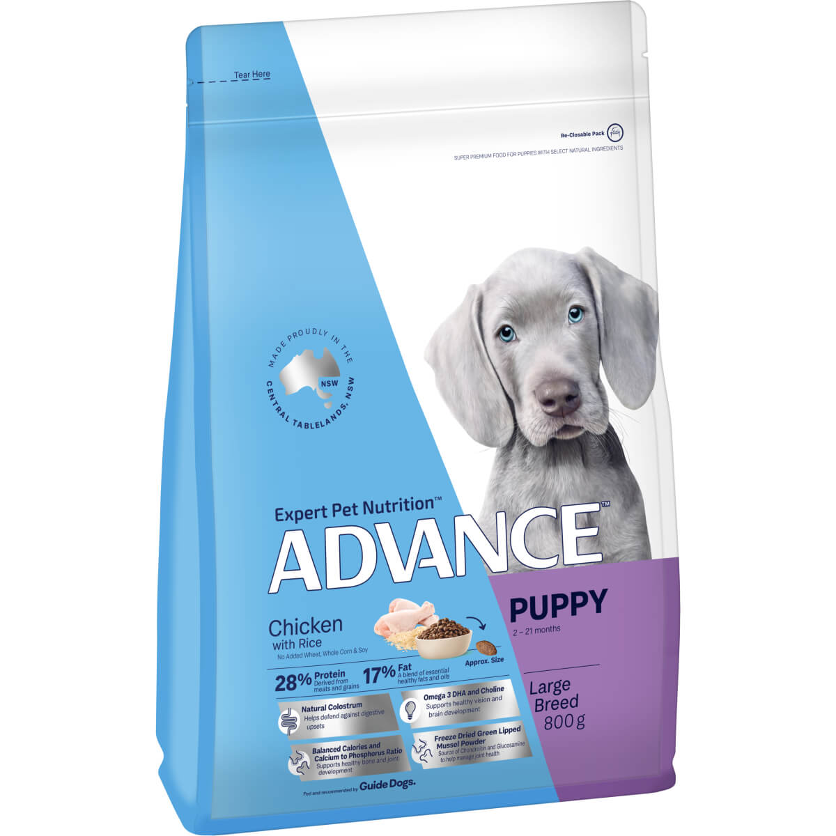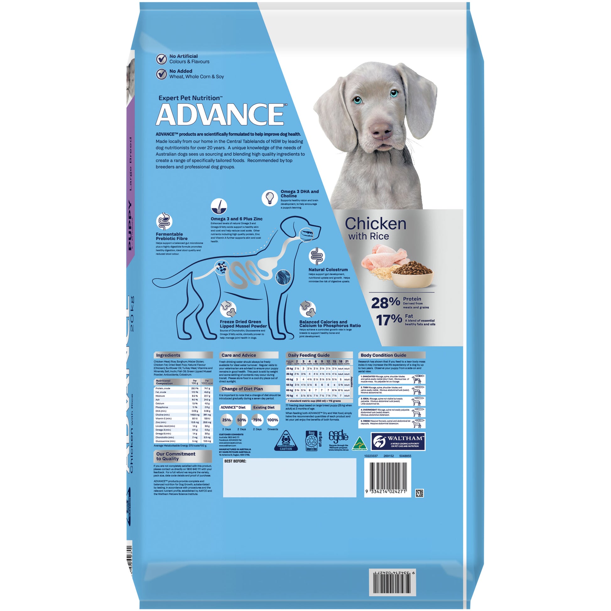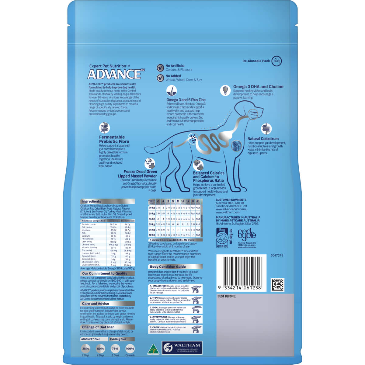 Advance Puppy Plus Large Breed Growth Chicken is a scientifically formulated, nutrient-dense diet designed to support the unique needs of large breed puppies from 2 to 15 months of age. Made in Australia using high-quality ingredients, this recipe includes natural colostrum to promote gut development and nutrient absorption, as well as fermentable prebiotic fibre to support a healthy gut microbiome and ideal stool quality. DHA and choline help support vision and brain development, while enhanced levels of omega 3 and 6 fatty acids, zinc and vitamin A maintain skin and coat health. This balanced formula is also suitable for feeding during pregnancy and lactation, and contains no artificial colours, flavours, wheat, whole corn, soy or beef.