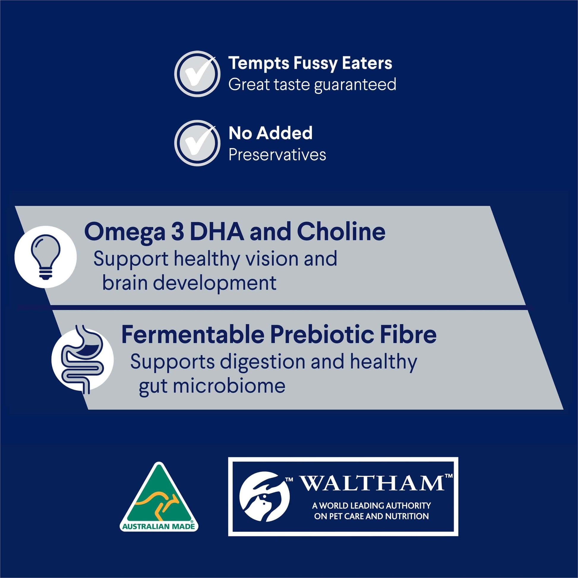 Made in Australia with over 45 years of nutritional expertise, this recipe combines high-quality chicken with key nutrients to promote healthy development. Antioxidants strengthen the immune system, while DHA and choline aid brain and learning function. Added zinc and linoleic acid nurture a shiny coat and healthy skin, and the controlled mineral levels help protect urinary tract health. The result is a diet that’s not only nourishing but also easy to digest for smaller, firmer stools.