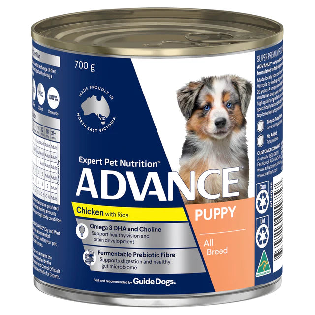 Advance Puppy Plus Growth Chicken & Rice is a premium canned dog food designed for puppies during their crucial growth stage. Suitable for all breeds, it also provides complete and balanced nutrition for pregnant and lactating dogs, supporting them through higher nutritional demands.