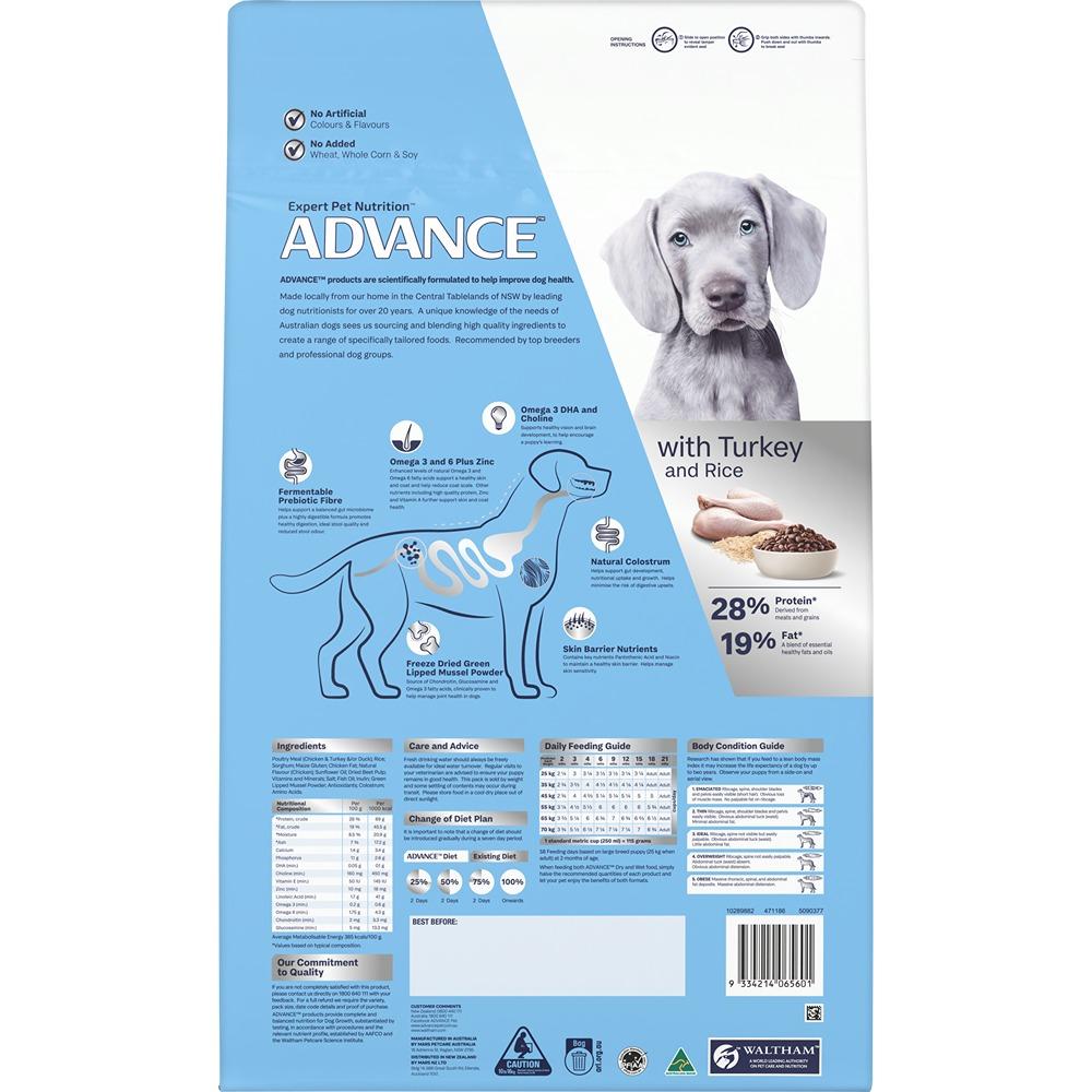 Advance Puppy Large Breed with Turkey & Rice Dry Dog Food is specially formulated to support the healthy growth and development of large breed puppies. Developed in Australia by leading dog nutritionists, this complete and balanced diet is tailored to meet the unique needs of growing pups expected to reach 25kg or more in adult weight. Its larger kibble size and carefully selected ingredients help support digestion, joint development, and overall wellbeing during the crucial growth phase from 2–21 months.