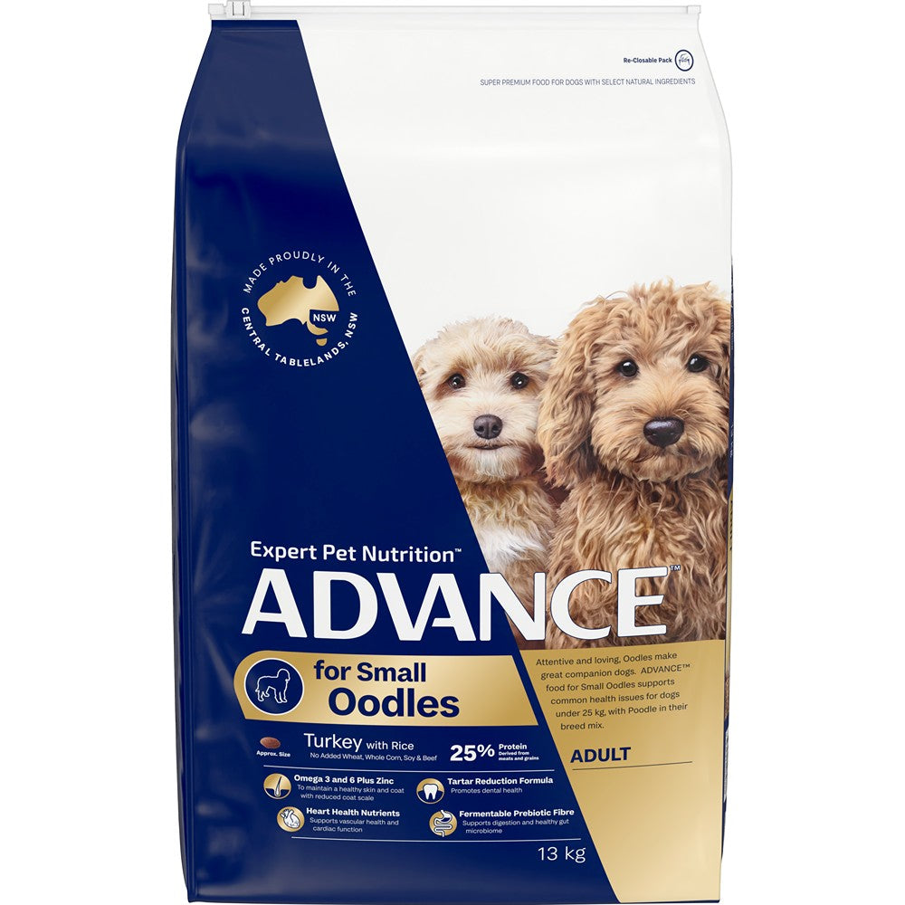 ADVANCE Small Oodles Dry Dog Food Turkey with Rice is specially formulated for small breed Oodles, providing complete and balanced nutrition to support their unique needs. Developed with a blend of global science and Australian expertise, this premium food promotes healthy digestion, skin, coat, and energy levels to keep your small Oodle thriving every day.