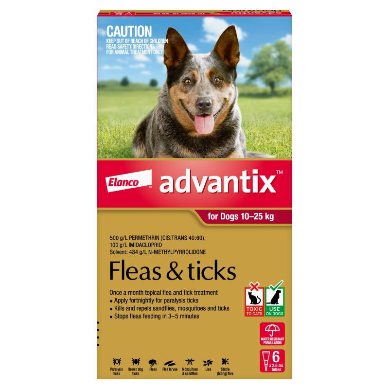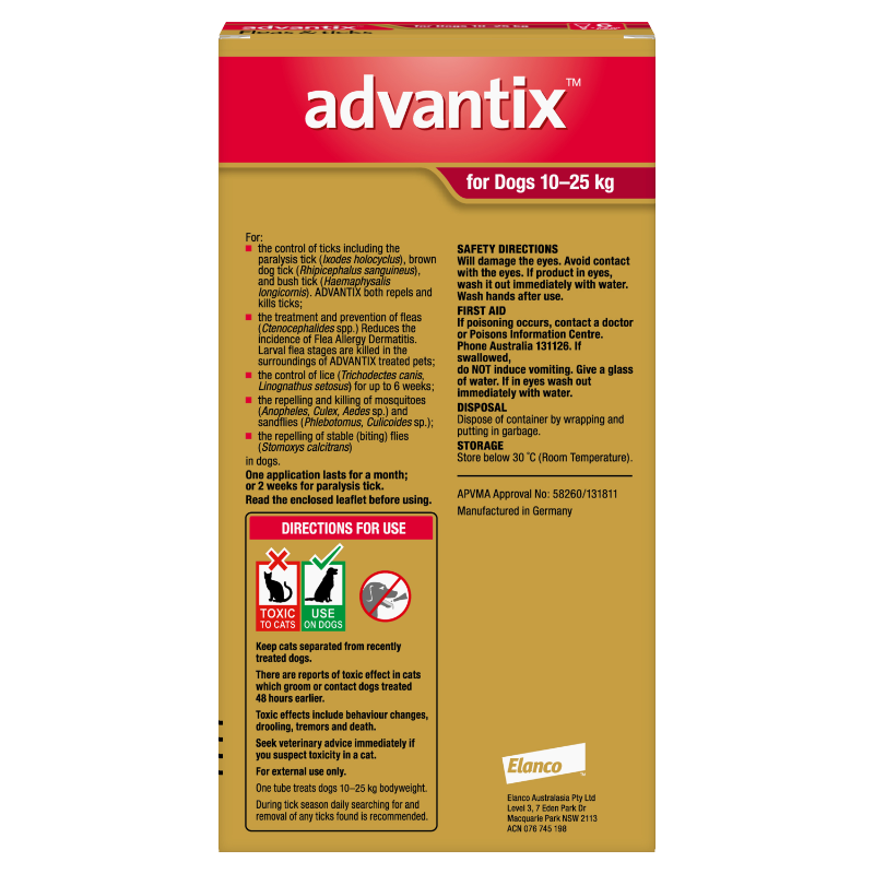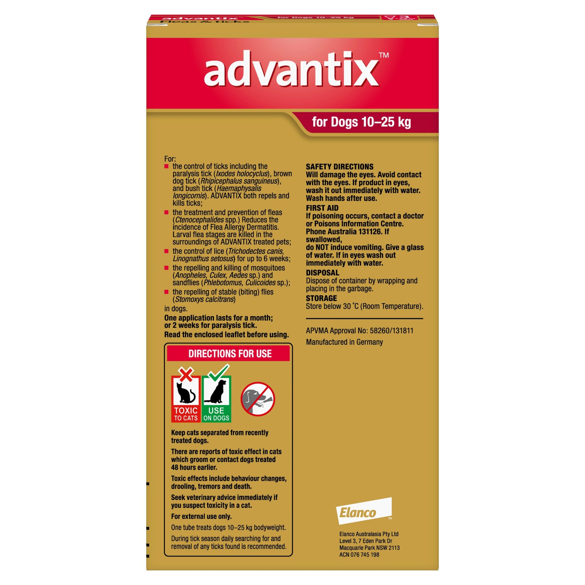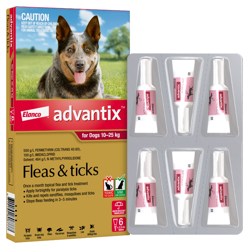 Advantix for dogs is a fast-acting, water resistant, easy to apply spot-on that repels ticks, mosquitoes, sandflies and stable flies and kills fleas and ticks on contact, so there's no need for them to bite! Reinfesting fleas stop biting in 3-5 minutes and are killed within 1 hour. Larval flea stages are killed in the pet's surroundings, and it reduces the incidence of flea allergy dermatitis. Protects against biting and sucking lice. Apply fortnightly to control paralysis ticks, or monthly for all other ticks and insects. Safe to use on puppies from 7 weeks of age and any weight. Also safe to use on pregnant and lactating dogs.