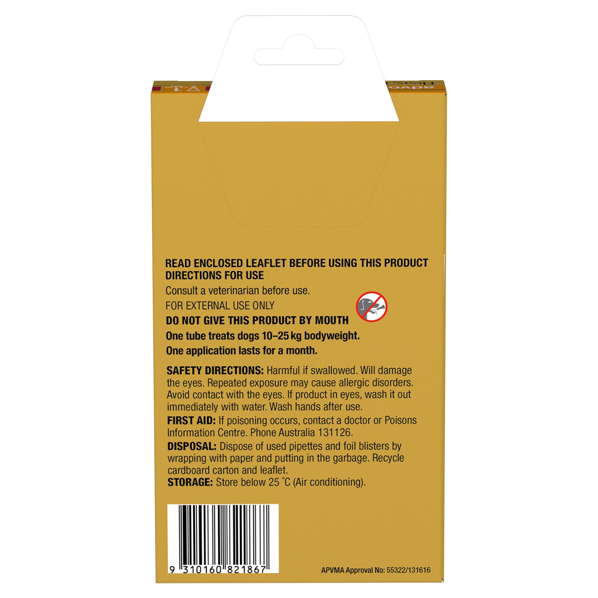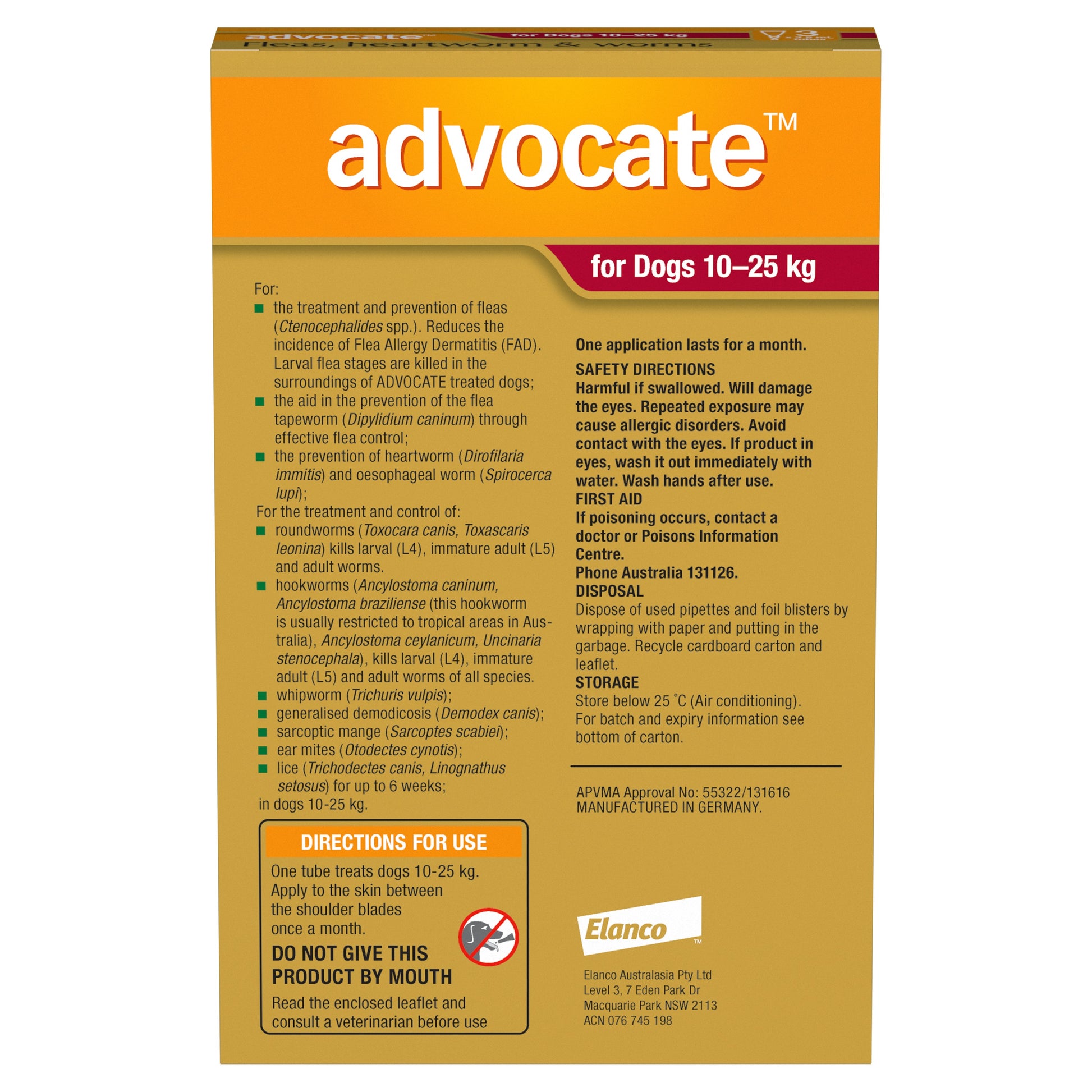 Advocate is a fast-acting, easy-to-apply monthly spot-on treatment that provides comprehensive protection against a wide range of parasites. Designed for large dogs weighing between 10 and 25 kg, it works quickly to kill fleas on contact — no biting required. Reinfesting fleas stop biting within 3–5 minutes and are eliminated within an hour. It also breaks the flea life cycle by targeting larvae in the dog’s environment and helps reduce the occurrence of flea allergy dermatitis.