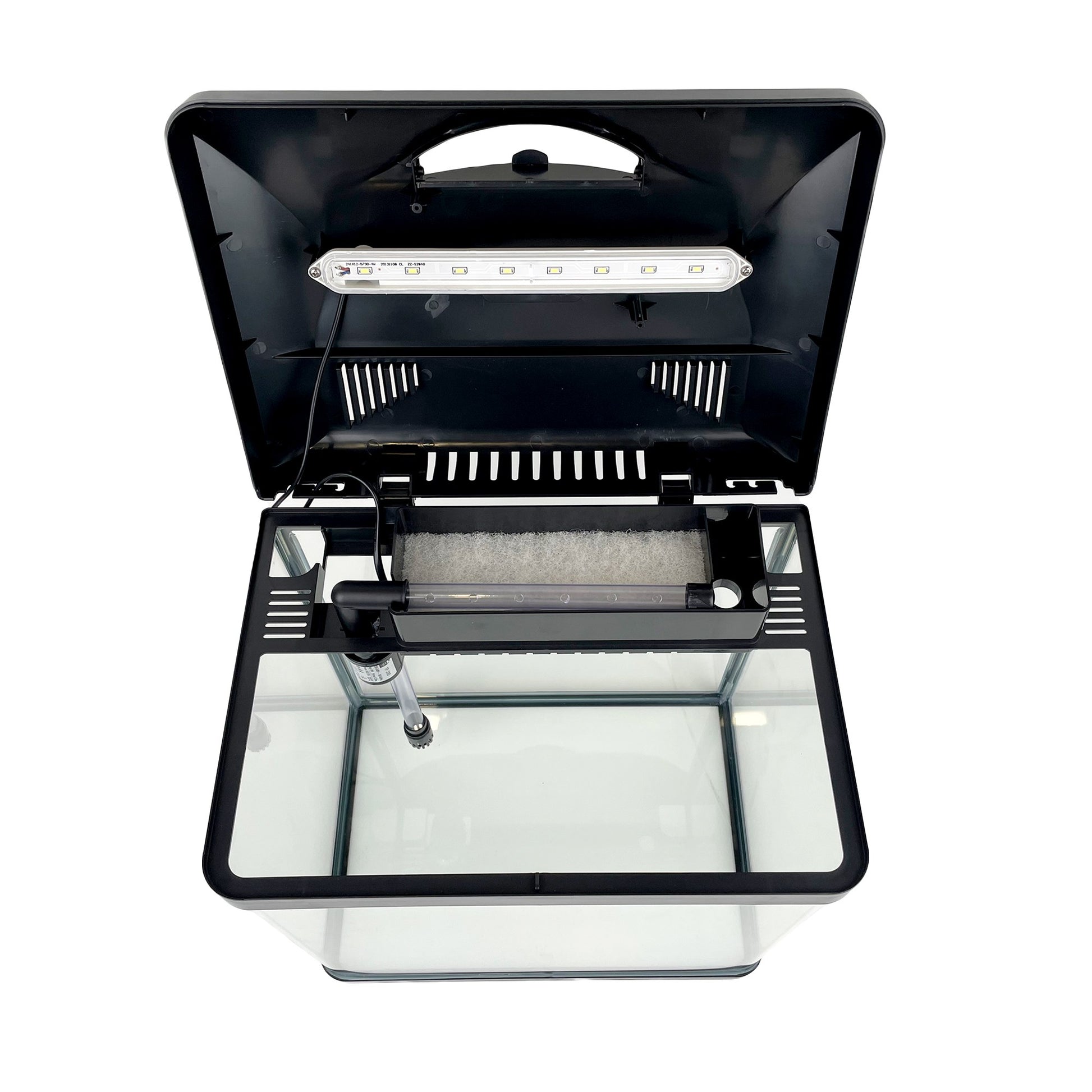 Every detail of the E-Series has been designed to simplify setup and ongoing care. The hinged lid keeps the light and filtration system neatly hidden while still providing ventilation and easy access for maintenance. A flip-up feeding point makes mealtime convenient, while the waterproof LED lighting safely replicates natural daylight and night cycles. The overhead biological filtration system, complete with ceramic noodles, spray bars, and filter pads, helps create a thriving ecosystem for your fish while reducing the effort required to keep the tank clean. Clear, step-by-step instructions are included so you can set up and enjoy your aquarium without stress.
