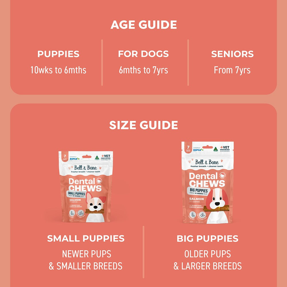 Bell & Bone Big Puppy Salmon Dental Chews are daily dental chews made for older puppies and larger breeds, helping to ease chewing urges while supporting oral care. With a shape that encourages thorough chewing, they’re great for busy pups who need something satisfying to gnaw while you protect growing teeth and gums.