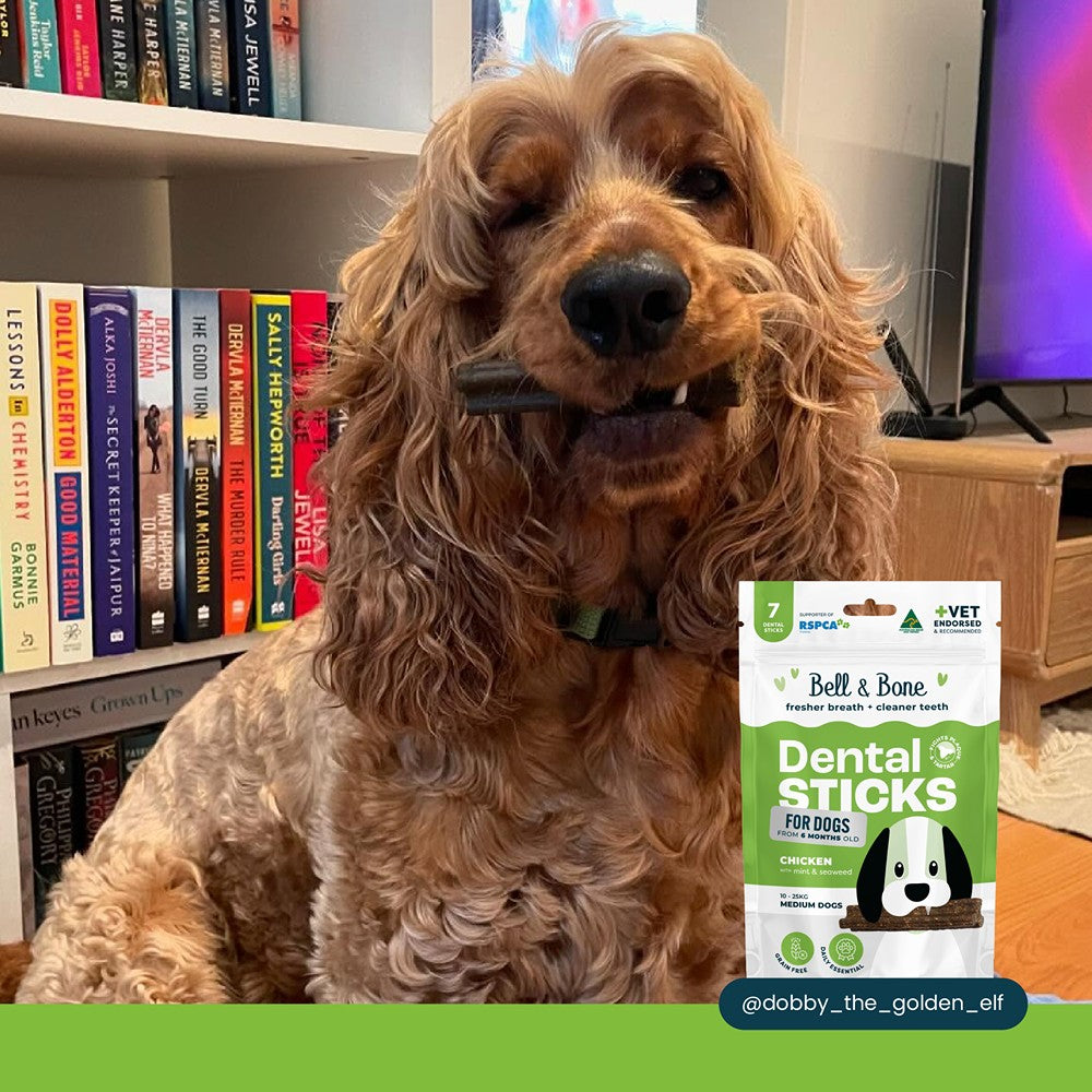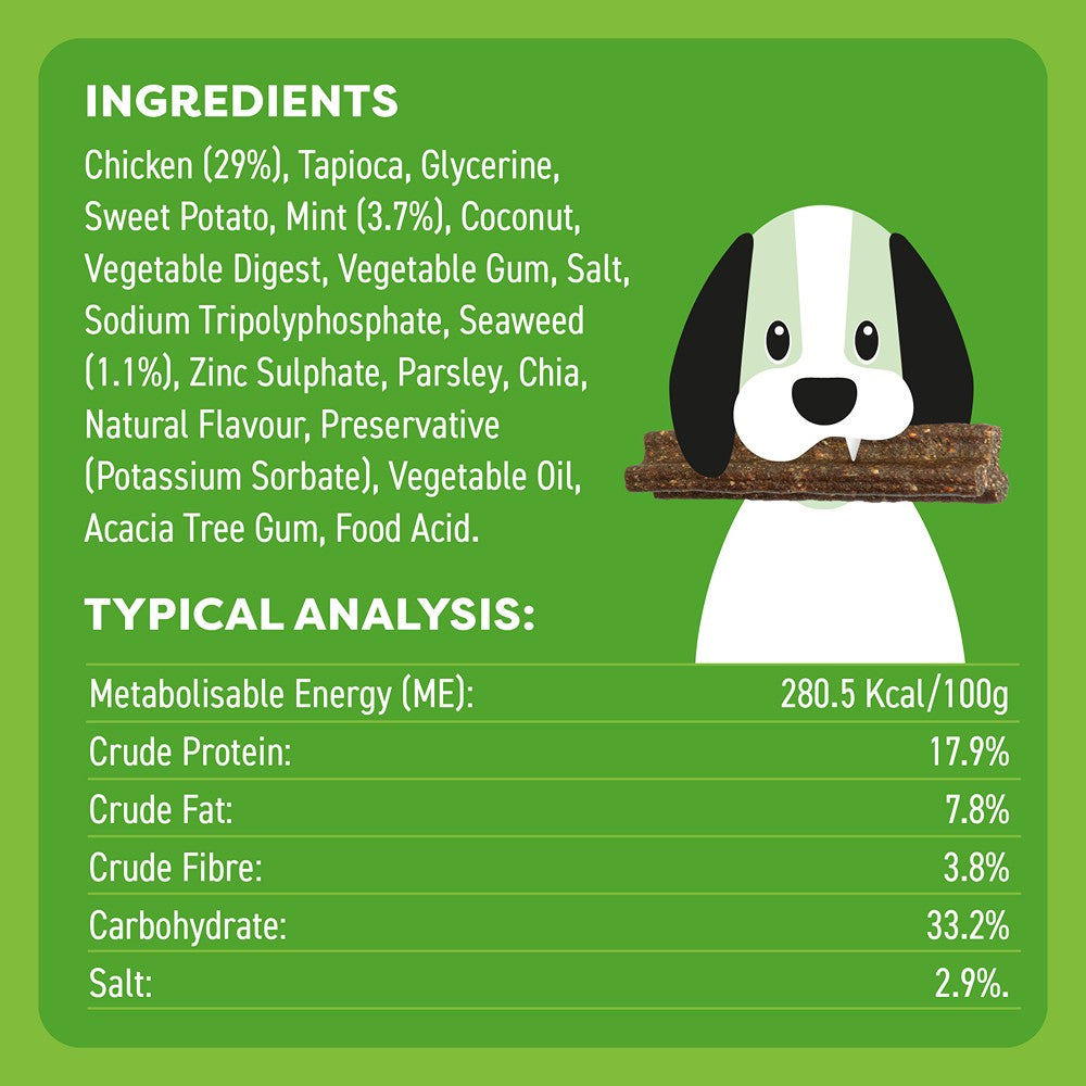 Bell & Bone's Chicken, Mint and Seaweed Dental Sticks are the perfect daily chew for your dog. They contain active ingredients that support oral care and help remove tartar from teeth. There are no nasties inside, with only healthy ingredients like chicken for a lean, high source of protein, mint for fresh breath and seaweed for its natural antibacterial properties. They can be fed daily for optimal results, and with their unique shape, they are great for getting teeth stuck into.
