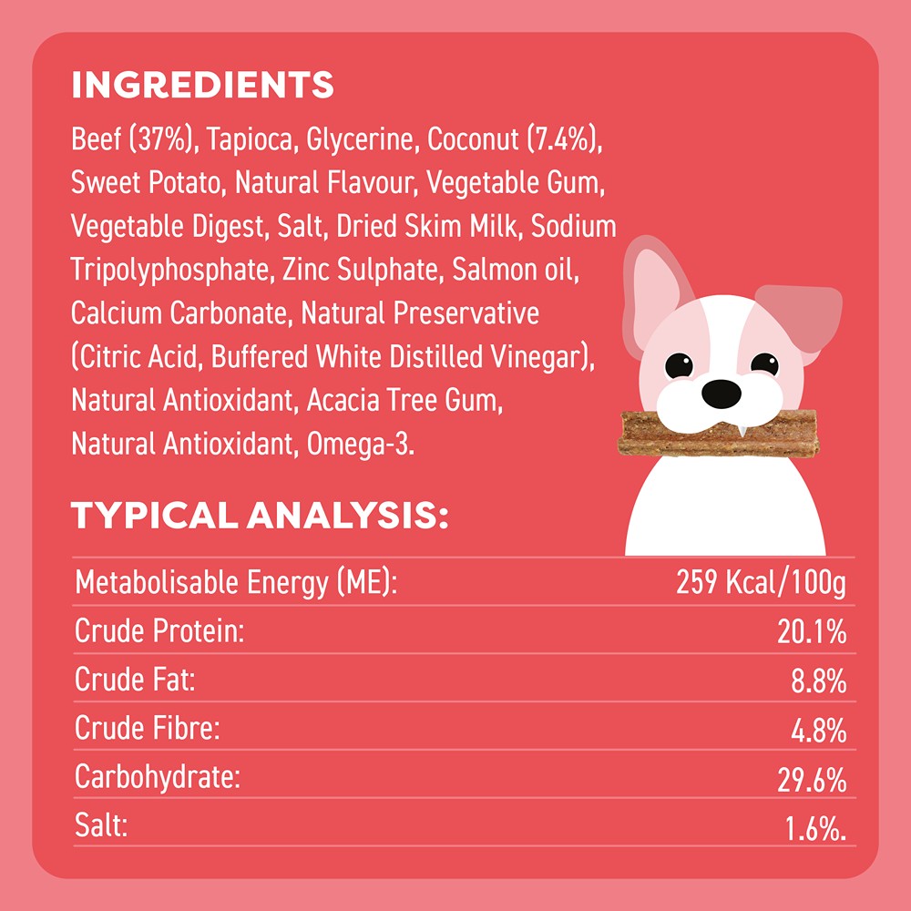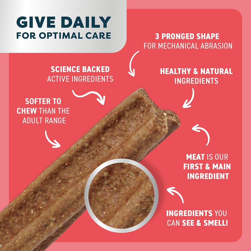 Made in Australia with natural ingredients, these chews combine beef as a high-quality protein source with amino acids to support growth and muscle development, and coconut to promote healthy skin, coat, joints, and digestion. Active ingredients help reduce plaque and tartar build-up, keeping teeth and gums strong while maintaining fresh puppy breath. Grain and filler free, they’re a clean and nutritious choice for everyday dental care.
