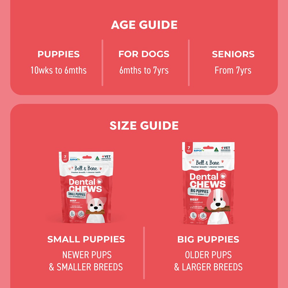 Bell & Bone Small Puppy Beef Dental Chews are designed for small breed puppies from 10 weeks of age, offering daily support for oral care and overall wellbeing. With a unique texture and shape, these chews help clean teeth while keeping pups engaged, easing stress and supporting healthy chewing habits.