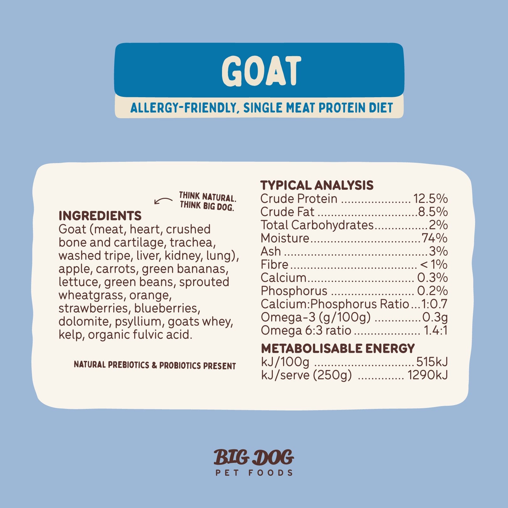 Big Dog Single Protein Goat is Complete and Balanced by AAFCO standards for healthy growth in puppies and maintaining health in adult dogs.