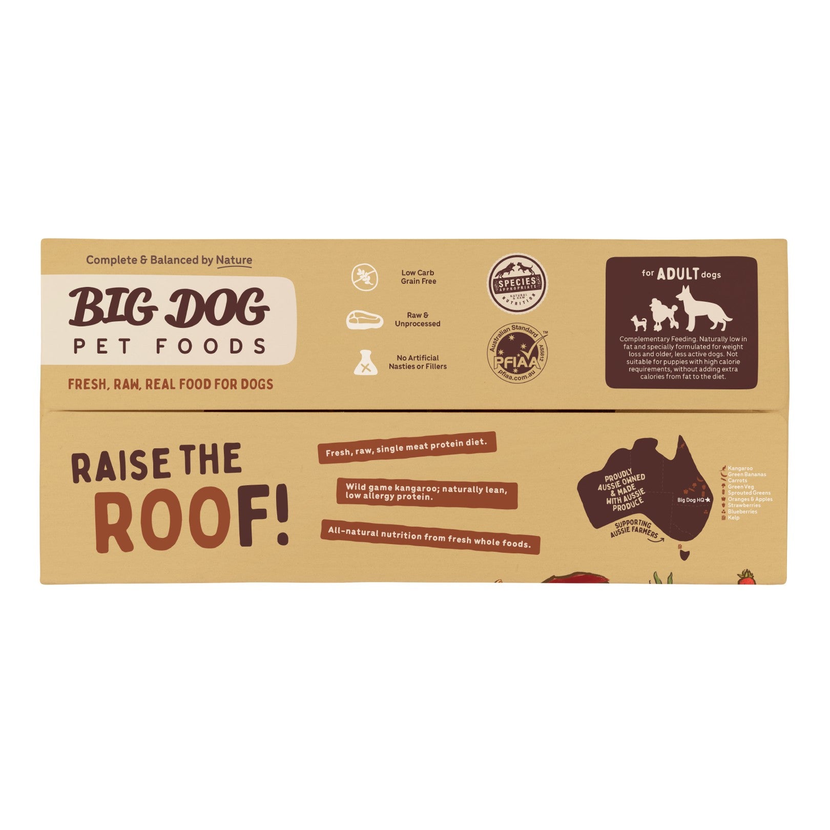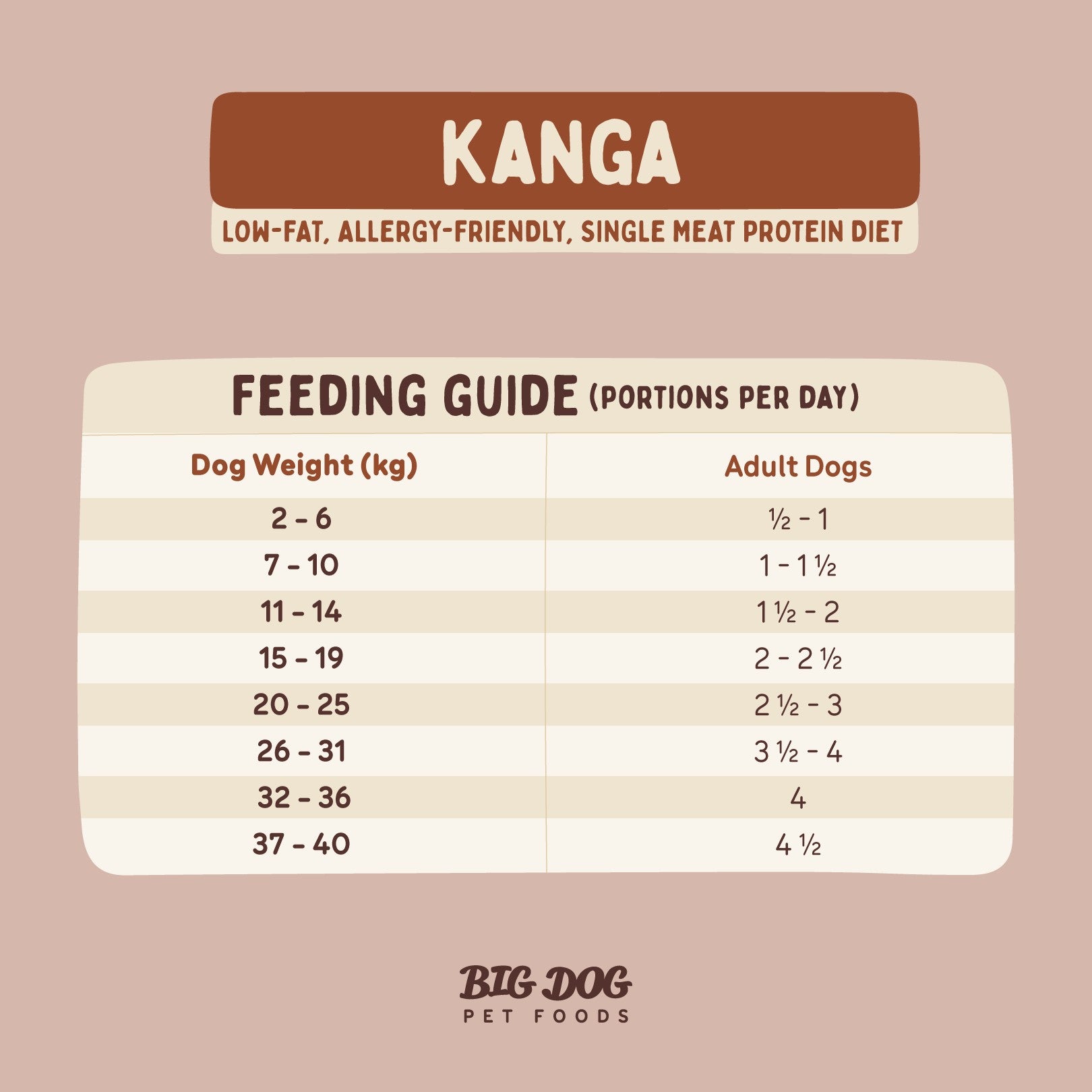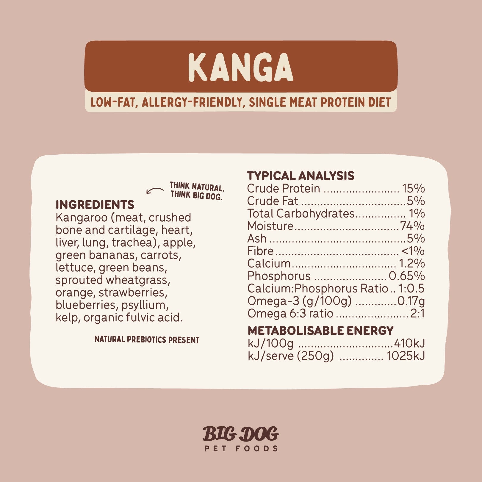 Big Dog Single Protein Kanga recipe is naturally low in fat and specially formulated for weight loss and older less active dogs. Not suitable for puppies with high calorie requirements, without adding extra calories from fat to the diet.