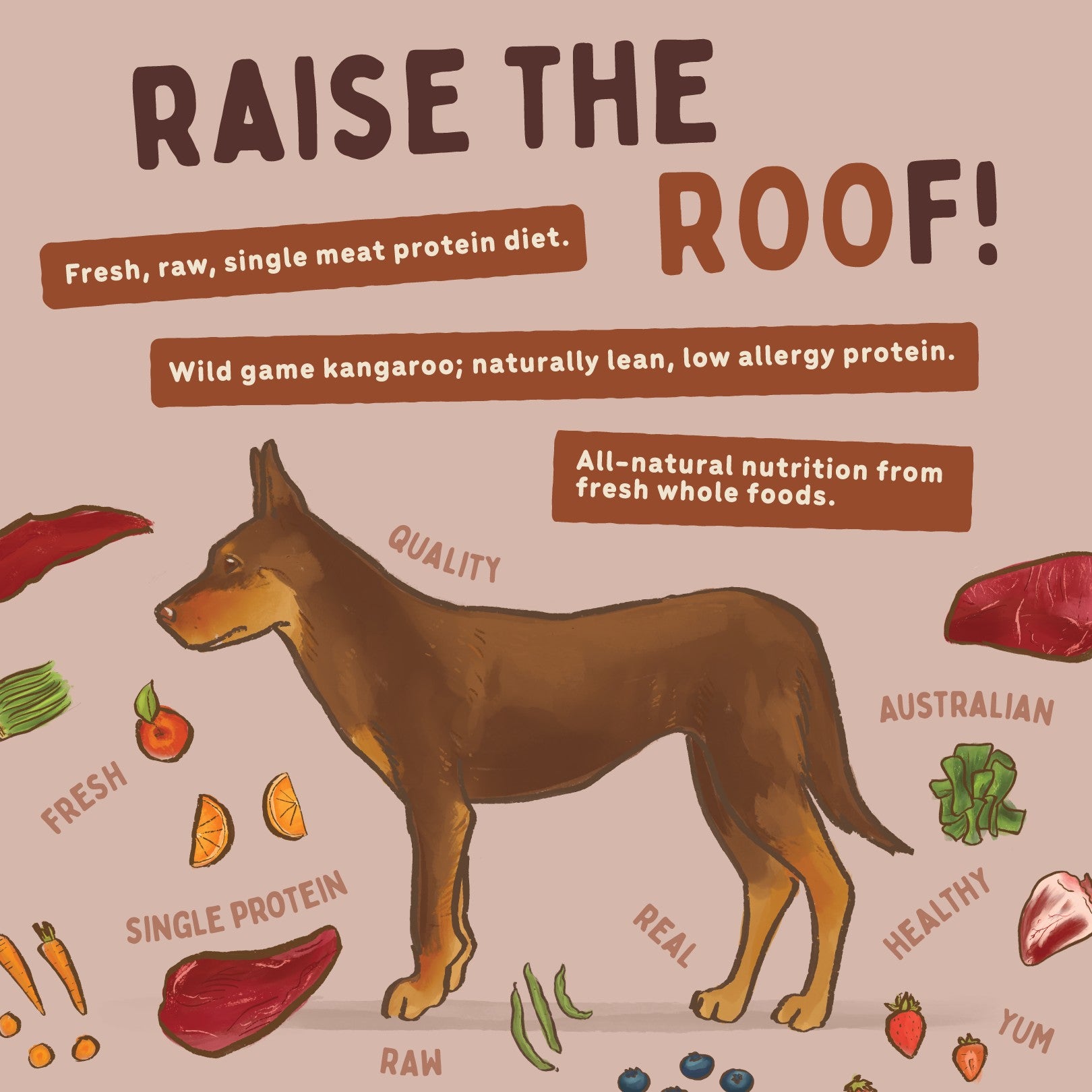 Kangaroo is a rich protein source and a perfect alternative for dogs who are allergic to other meat proteins. Low in fat and easy to digest, this single protein Kanga recipe is suitable for overweight dogs or dogs that need a low-fat diet for medical conditions as advised by a veterinarian. Being a wild-game source, Australian kangaroo has minimal to no exposure to environmental chemicals, making it even more suitable for dogs that suffer from allergies.