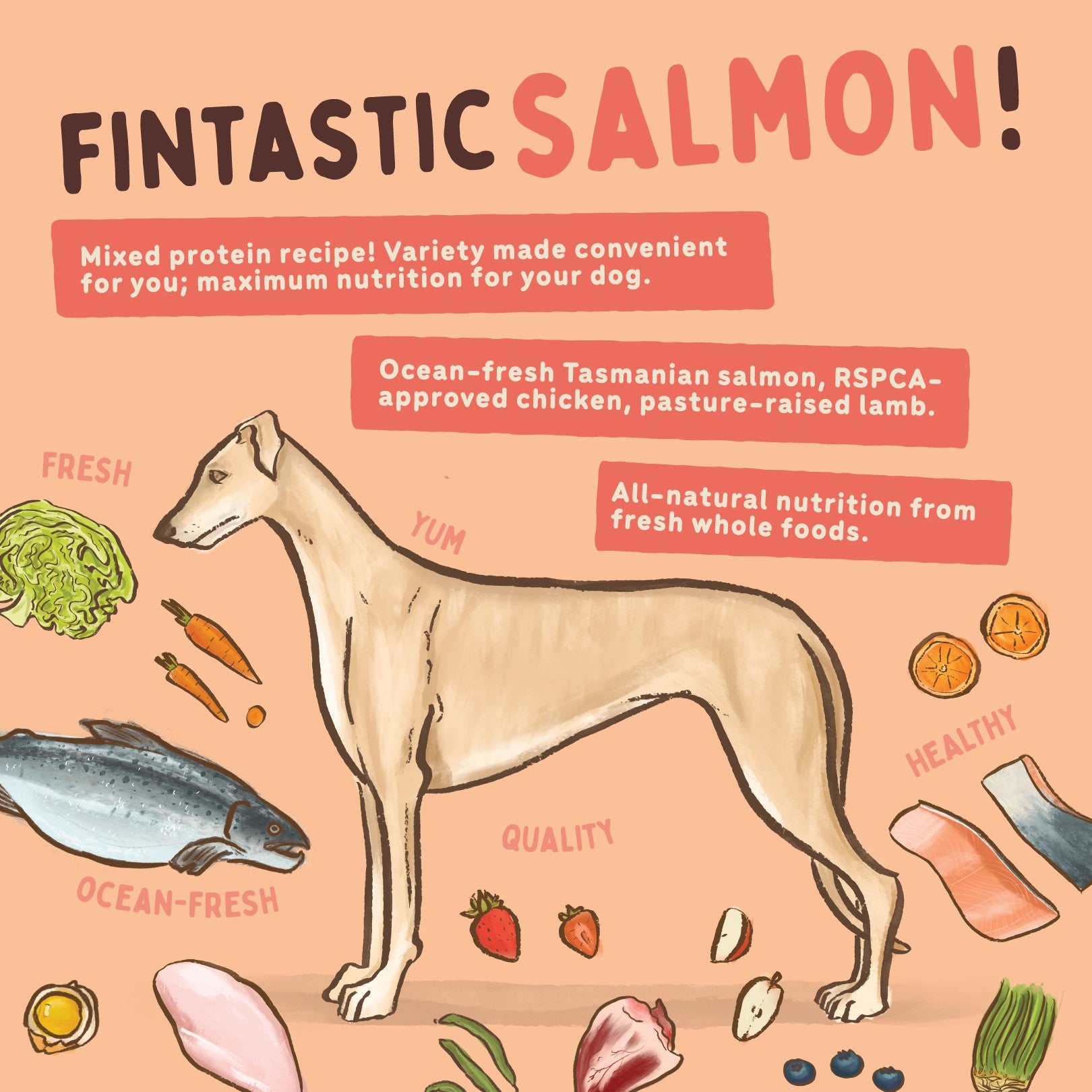 Loaded with fresh, ethically farmed Tasmanian salmon, this recipe is for the four-legged seafood lover in your family. Additional high-quality protein and bone from fresh RSPCA-approved chicken, as well as vitamin and mineral-rich offal from Australian pasture-raised lamb makes this recipe a well-rounded omega-3 rich feast!