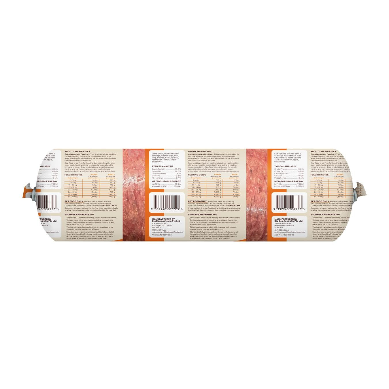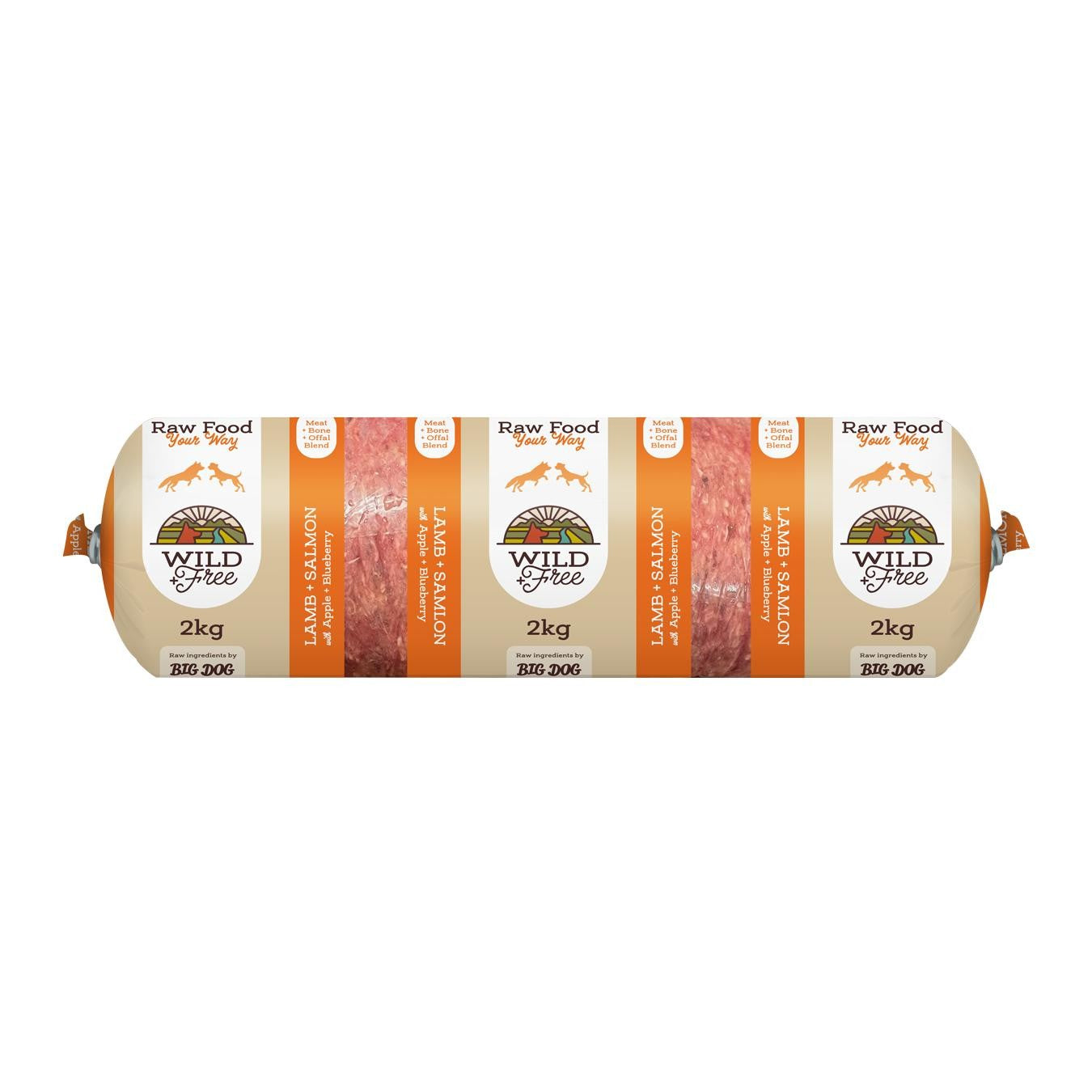 Wild and Free’s all-natural and convenient raw dog food rolls are designed for DIY feeders who have difficulty sourcing meat, offal and bone. Our pre-minced ingredients are a time saver by offering the convenience of quality raw ingredients to build your pet's nutritious meals. The Complementary Feeding design gives you the freedom to customise your dog’s meal with additional ingredients of your choice.Our Lamb & Salmon with Apple + Blueberry roll is made from fresh and carefully sourced ingredients, containing the meat, offal and bone of Australian pasture-raised lamb and ethically farmed Tasmanian salmon. The added apple aids in immune health for your dog, and the blueberry provides heart health benefits. Both ingredients support gut health and work as a prebiotic and antioxidant. Benefits: