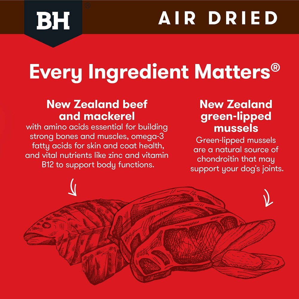 Black Hawk Air Dried Dog Food Beef & Mackerel is a premium, high-protein diet designed for adult dogs who need a nutrient-rich, balanced meal. Made with 94% real New Zealand beef and mackerel, this complete formula delivers the perfect blend of red meat protein and omega-rich fish to support muscle strength, sustained energy, and overall wellbeing. The gentle air-drying process locks in nutrients and enhances flavour, creating a soft, meaty texture that dogs find irresistible—ideal as a complete meal, nutritious topper, or high-protein treat.