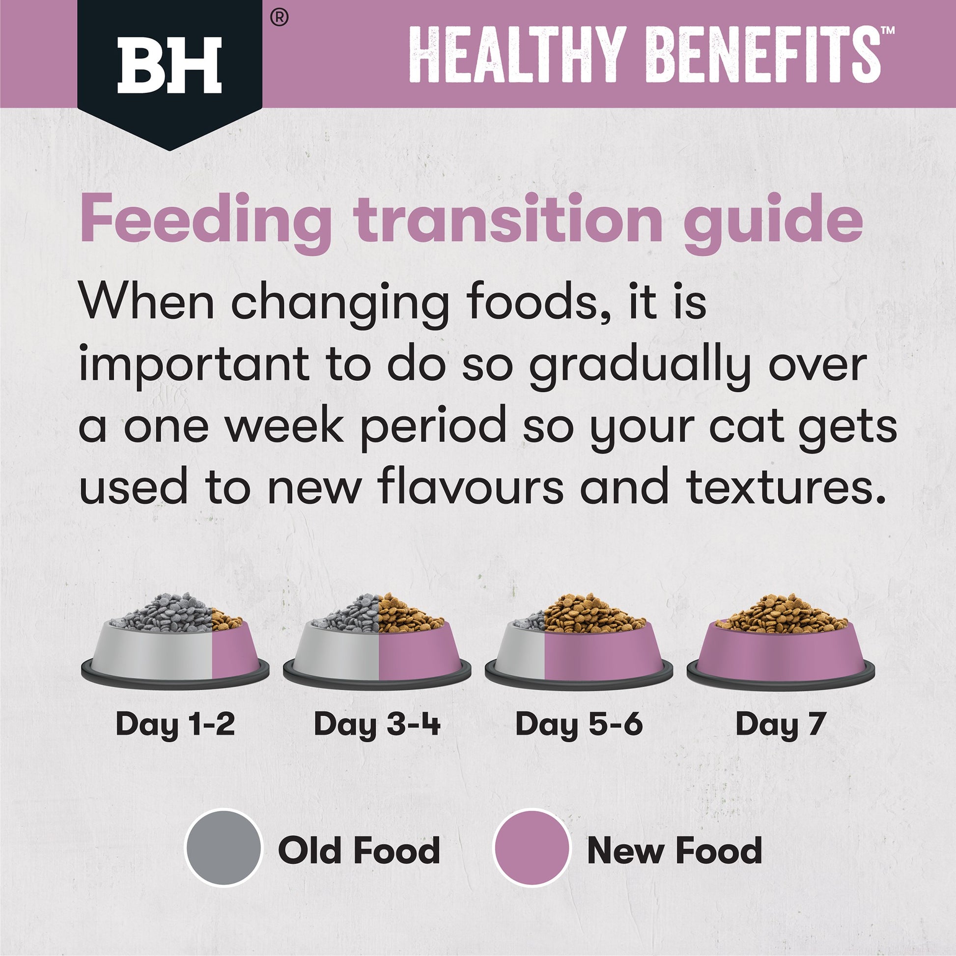 The Black Hawk Healthy Benefits range has been developed by our animal nutritionists and vets to help you respond to your cat’s needs. Each product combines carefully selected ingredients with the vital nutrients and minerals best suited to support cats’ wellbeing and lifestyle. Help manage hairballs in your adult cat with this tasty, nutrient-rich kibble. Offering complete and balanced nutrition, it is also high in protein, essential fatty acids, vitamin E, biotin and zinc for healthy skin and fur. A unique, high fibre ingredient mix helps ease digestion and manage hairball formation.