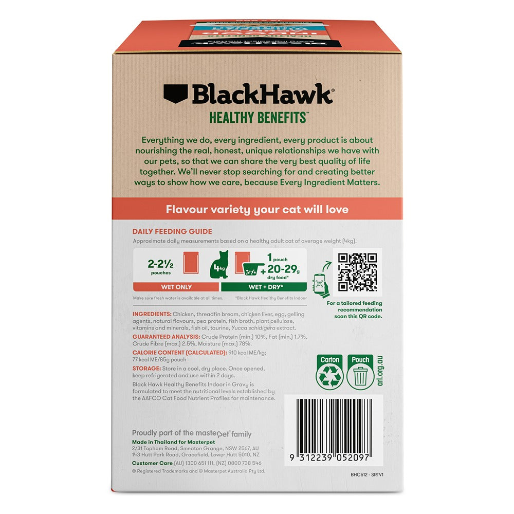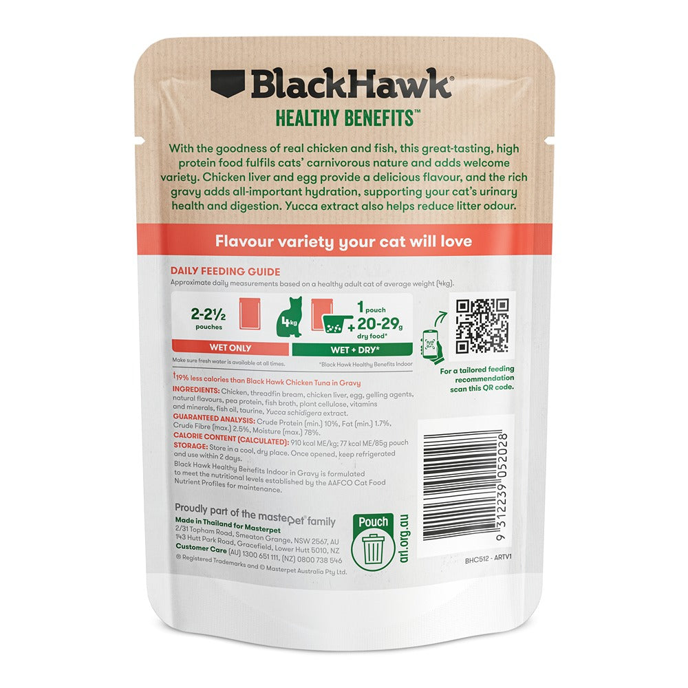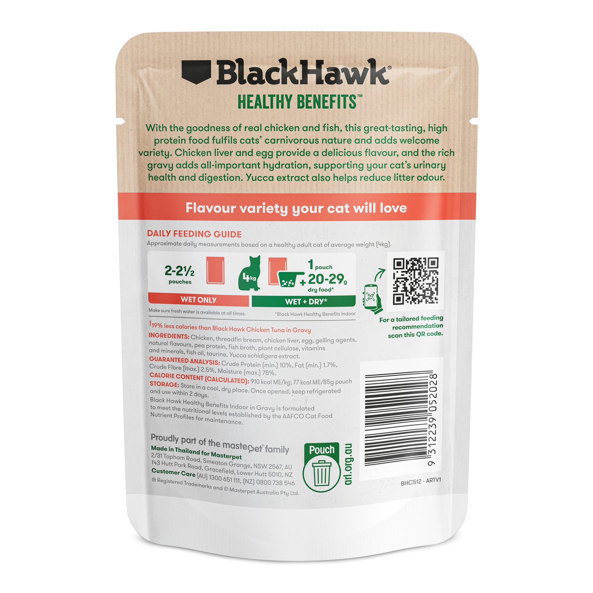 The Black Hawk Healthy Benefits range has been developed by our animal nutritionists and vets to help you respond to your cat’s needs. Each product combines carefully selected ingredients with the vital nutrients and minerals best suited to support cats’ wellbeing and lifestyle. Formulated for indoor cats with the goodness of real chicken and fish, this great-tasting, reduced calorie diet*, fulfils cats’ carnivorous nature and adds welcome variety. Chicken liver and egg provide a delicious flavour, and the rich gravy adds all-important hydration, supporting your cat's urinary health and digestion. Yucca extract also helps reduce litter odour.