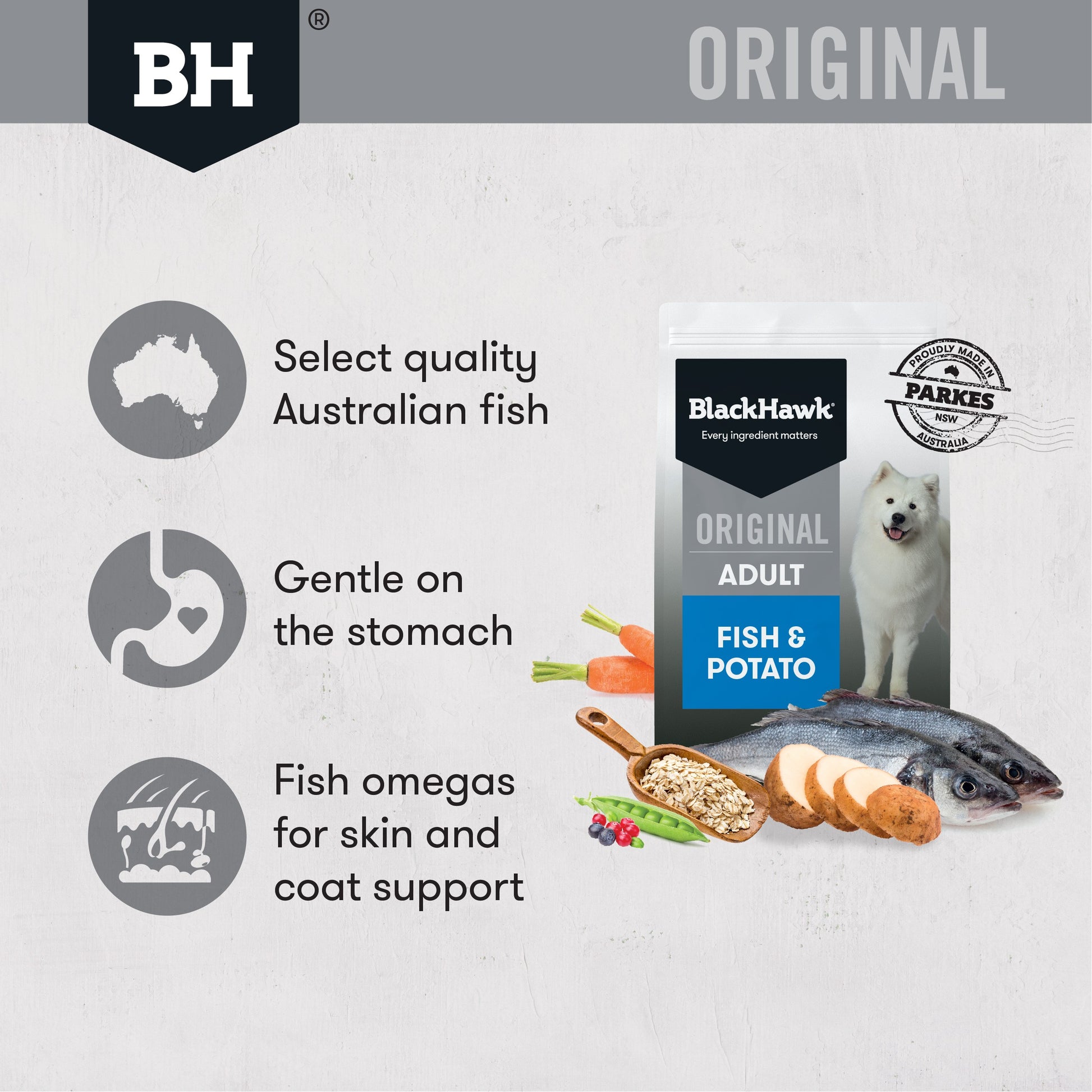 Need Black Hawk Original Fish & Potato Adult Dry Dog Food today? You can pick up your order in just 15 minutes from your local Petstock store with Click & Collect, or get same-day delivery when you order before 4 pm in metro areas from select stores – it's the fastest way to get dog food! Plus, when you shop with Petstock, you can earn Everyday Rewards points, collect Petstock Pet Cash to redeem on your next purchase, and save time by setting up flexible Repeat Delivery.