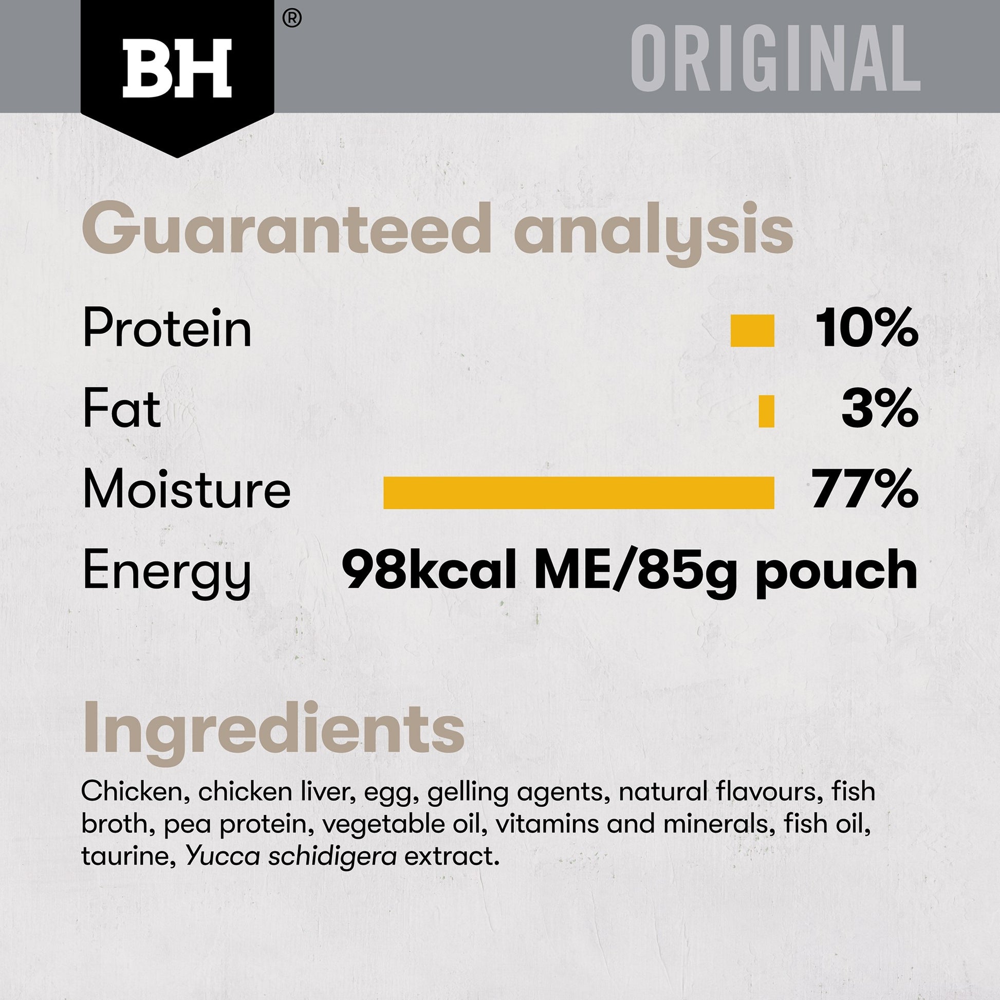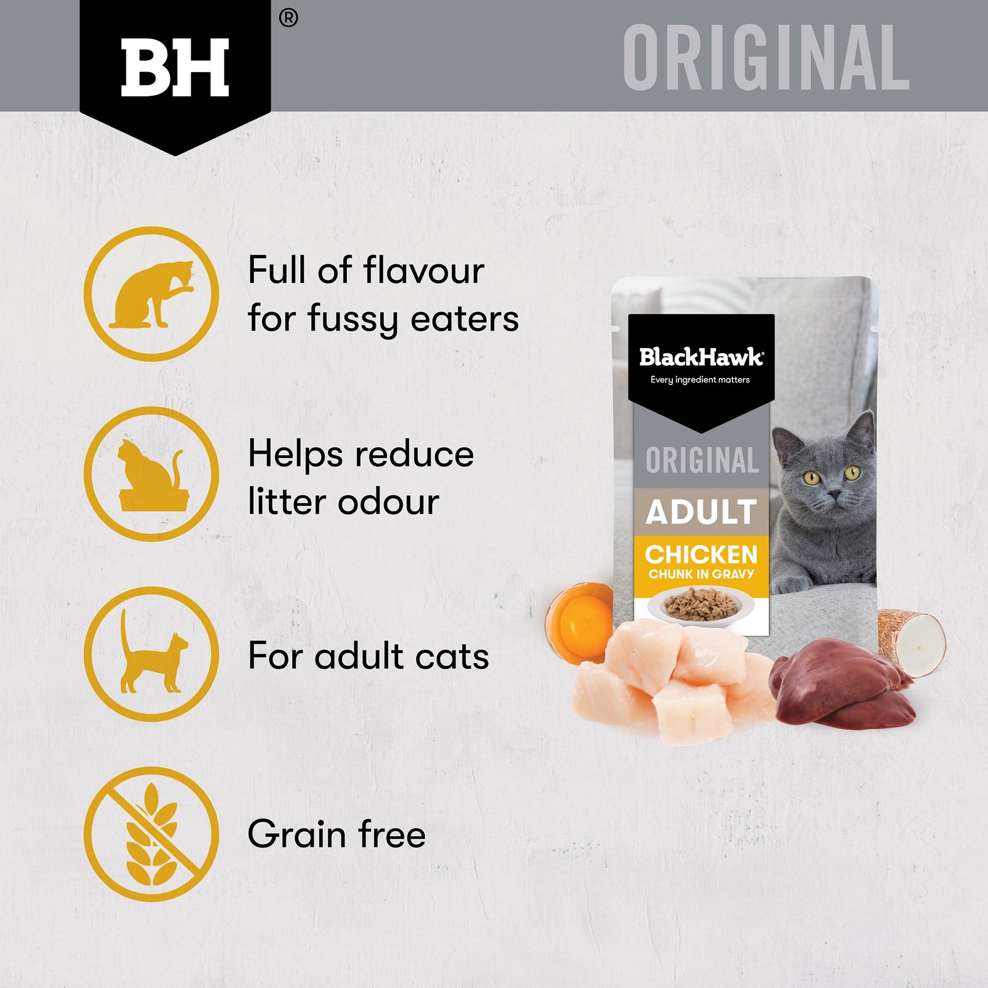 Specifically developed for cats, with proteins and textures they love, and the complete and balanced nutrition they need. Every ingredient that goes into our recipes has a nutritional purpose, so you’ll never find wheat, corn, soy, artificial preservatives, colours or flavours in Black Hawk. With the goodness of real chicken, this great-tasting, high protein food fulfils cats’ carnivorous nature and adds welcome variety. Chicken liver and egg provide a delicious flavour, and the rich gravy adds all-important hydration, supporting your cat's urinary health and digestion. Yucca extract also helps reduce litter odour.