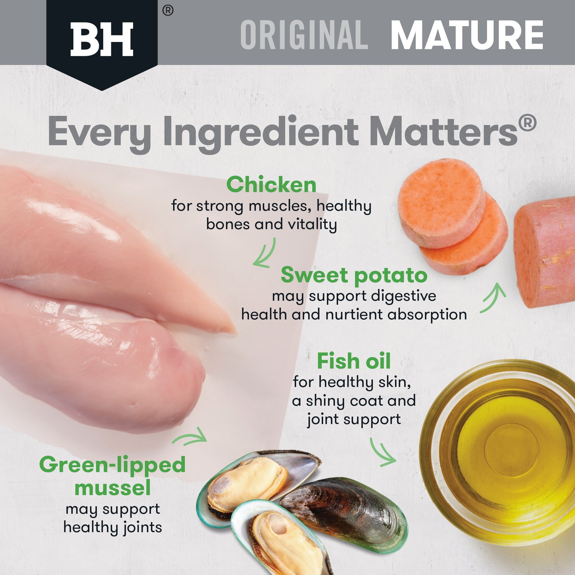 Developed with input from animal nutritionists and vets, Black Hawk Original Mature also contains chicory root to support digestive health, blueberries and cranberries for antioxidant support, and green-lipped mussels which may help maintain joint health. Sweet potato is included as a rich source of fibre to support nutrient absorption and healthy digestion.