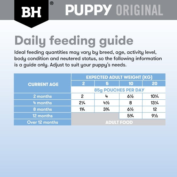 Created with the help of animal nutritionists and vets, it includes tomatoes, which may help support your puppy’s immunity and natural defenses, and peas, which deliver energy and gut- stimulating nutrients. Available in convenient pouches, you can offer this tasty product on its own or use as a topper for Black Hawk Puppy dry food.