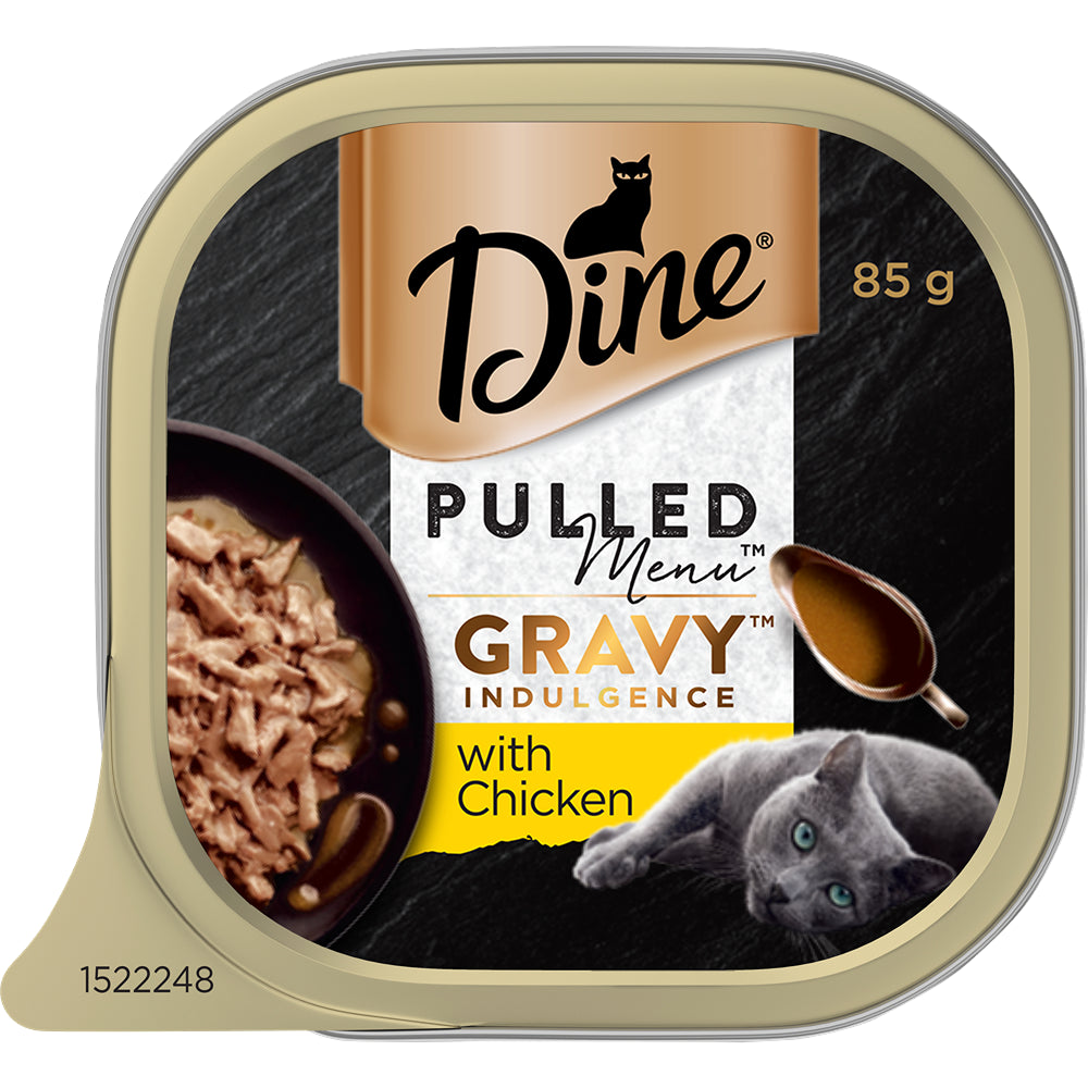 Introducing DINE Cat Food. Delicious meals for your cat, carefully created from premium quality ingredients. DINE® Pulled Menu. Succulent slow cooked meaty shreds for the ultimate burst of juicy, meaty flavour, with added sumptuous gravy for an unrivalled taste sensation.