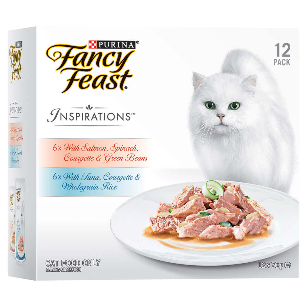Fancy Feast Inspirations Salmon, Spinach, Courgette and Green Beans is fine, delicate cuts of salmon combined with carefully selected ingredients including spinach, courgette and green beans.