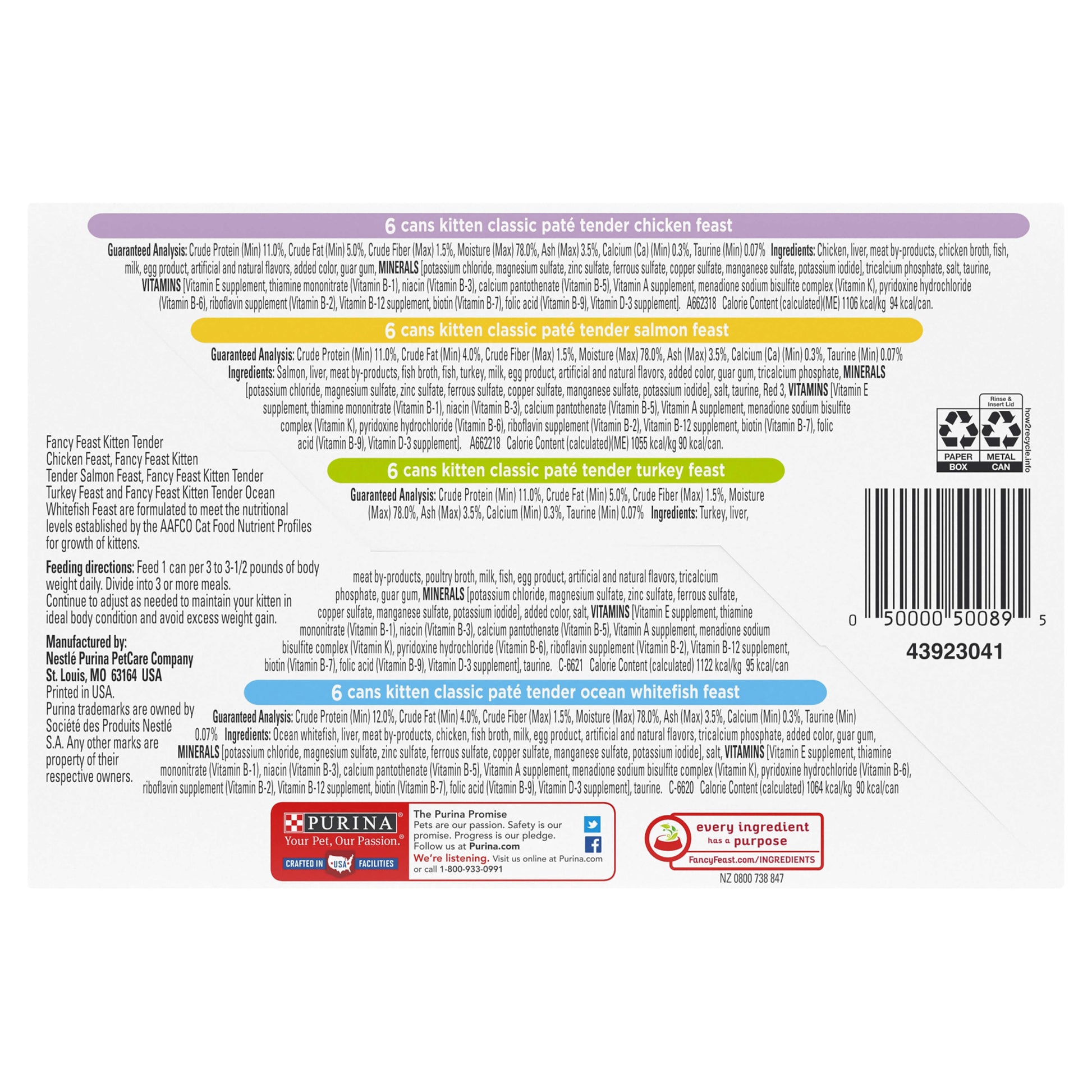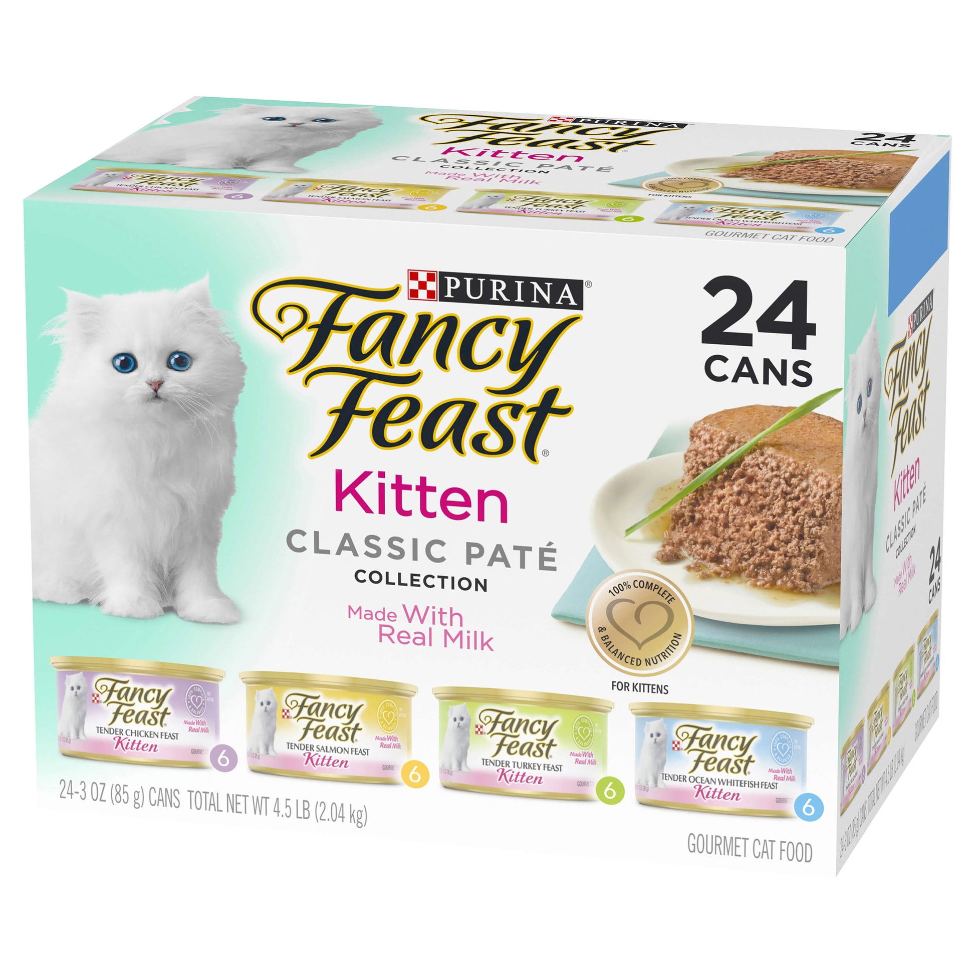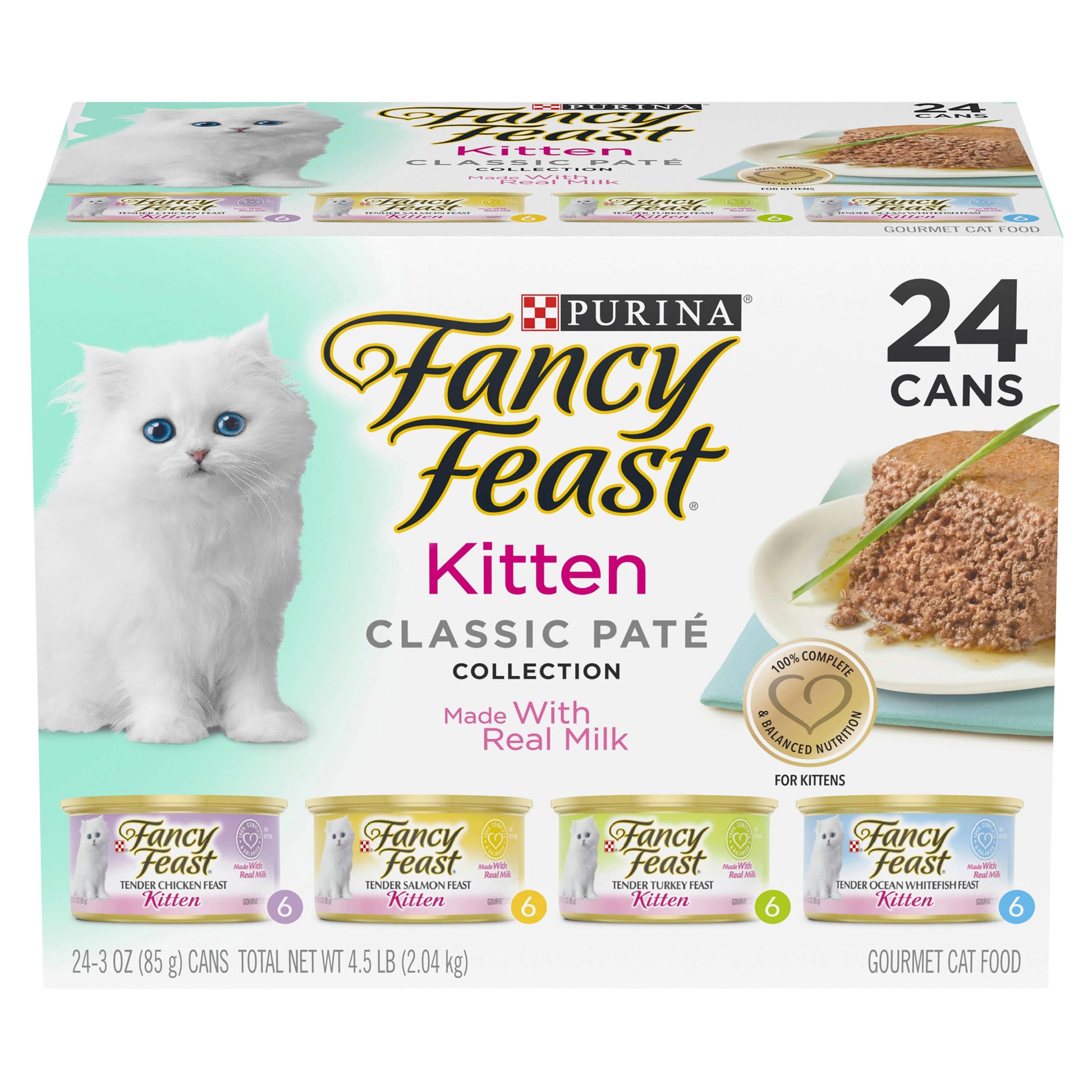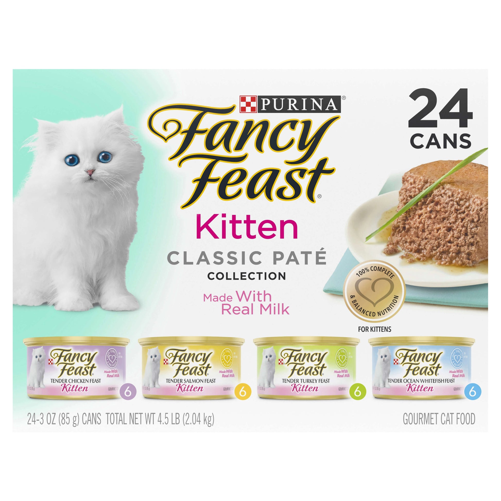 FANCY FEAST Classic Patè is a highly palatable, gourmet wet cat food made for kittens. This collection pack features a delicious combination of your cat's favourite flavours in the texture they love. Finely ground paté made with real chicken, salmon and ocean whitefish. A glorious feast for your cat! Available in a convenient 24 pack, consisting of 8 x chicken, 8 x salmon and 8 x ocean whitefish varieties.