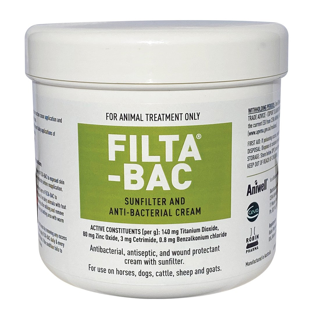 Filta-Bac Antibacterial Sunscreen is a dual action product for your pet's skin care. It provides effective protection from the sun for sensitive or damaged skin, while also acting as an antibacterial treatment to assist healing for wounds or skin conditions.