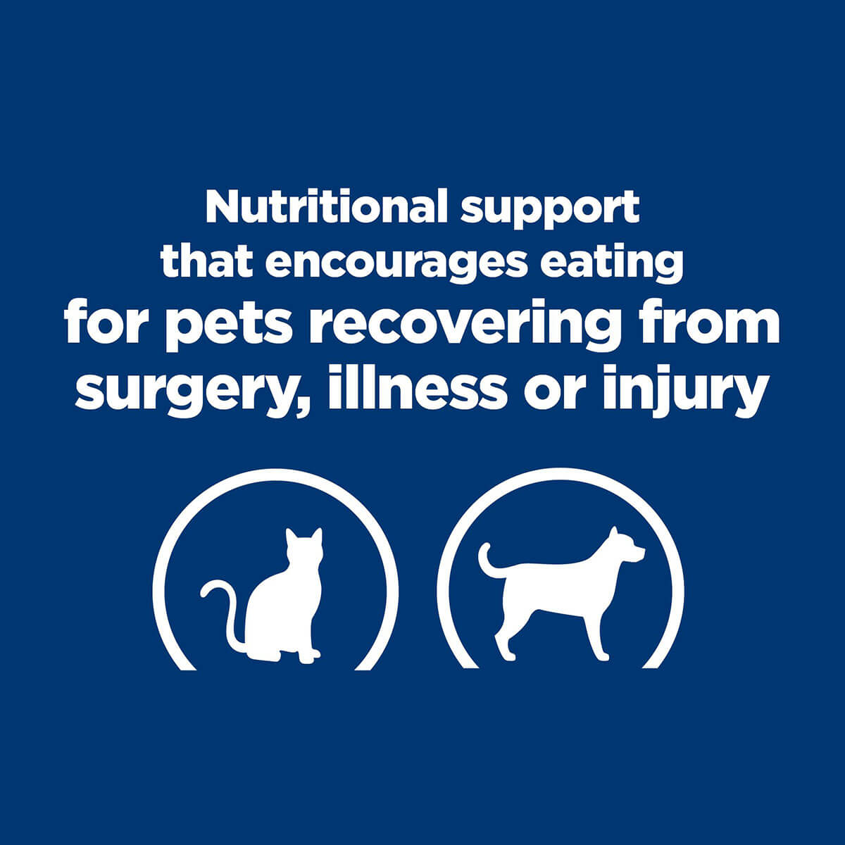 This food has exceptional taste to encourage eating and includes increased clinically proven antioxidants to support immunity. It also has a consistency that is smooth, soft and moist and stirring makes it more liquid for maximum flexibility in feeding - by hand, bowl, spoon, and suitable for syringe or tube feeding by a veterinarian. Please consult your veterinarian for further information on how Prescription Diet foods can help your dog or cat.