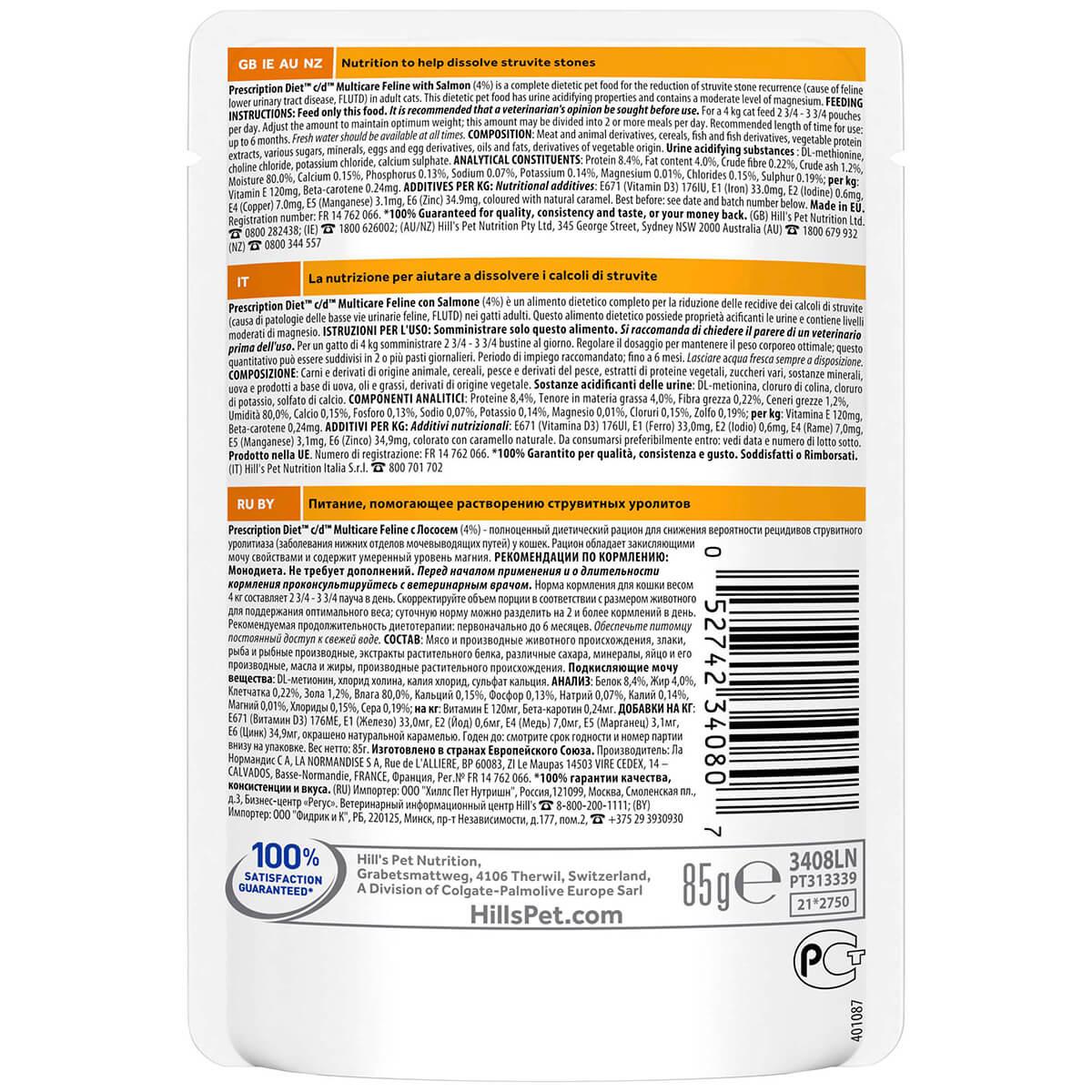 Hill's Prescription Diet c/d Multicare cat food with salmon is clinical nutrition specially formulated to support your cat's urinary health. It is a urinary tract cat food clinically proven to lower the recurrence rate of the most common urinary signs by 89%. This wet cat food is made with chicken and has a mouthwatering taste that your cat will love.