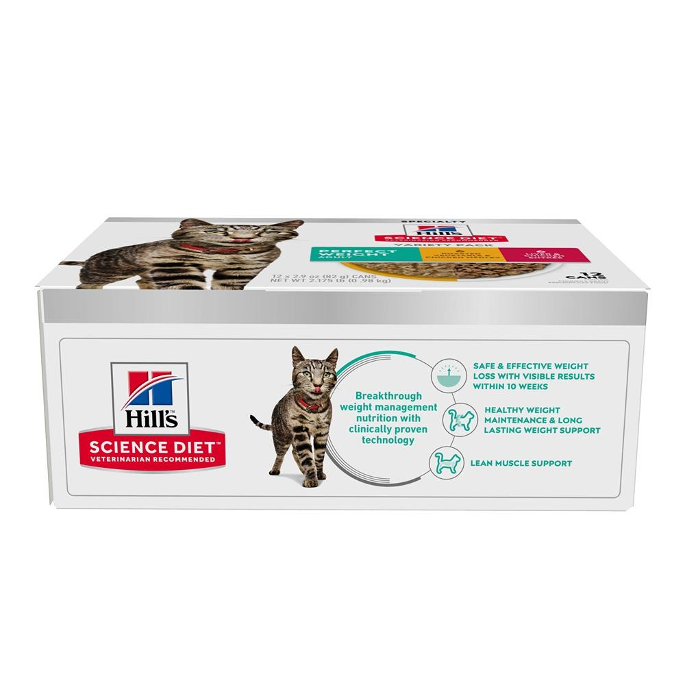 Hill's Science Diet Perfect Weight wet cat food can help your cat achieve a healthy weight and improve their quality of life. Give your cat two delicious varieties of canned cat foods in this weight management variety pack. Over 70% of cats lost weight within 10 weeks when fed this breakthrough nutrition (research on file, Hill’s Pet Nutrition, 2011). Plus, Hill's Science Diet Perfect Weight wet foods provide weight maintenance nutrition to leaner cats.