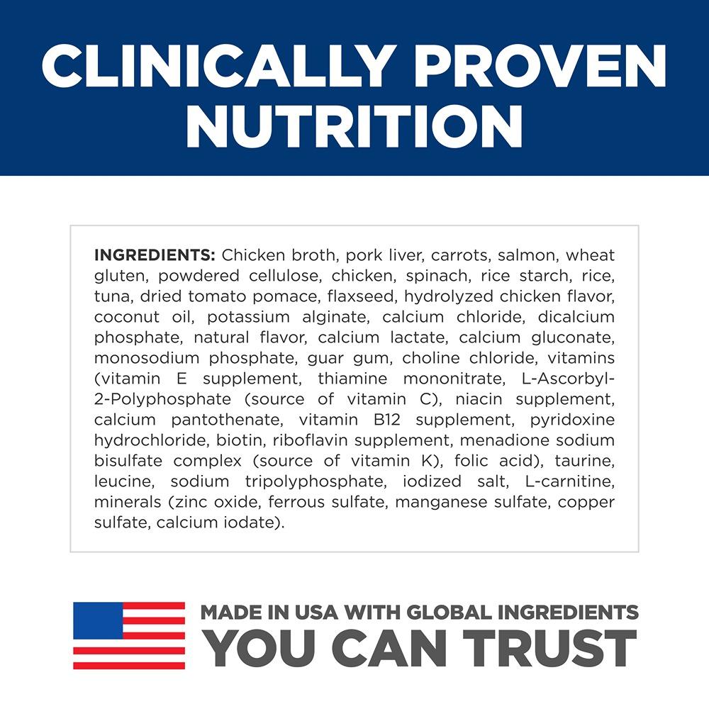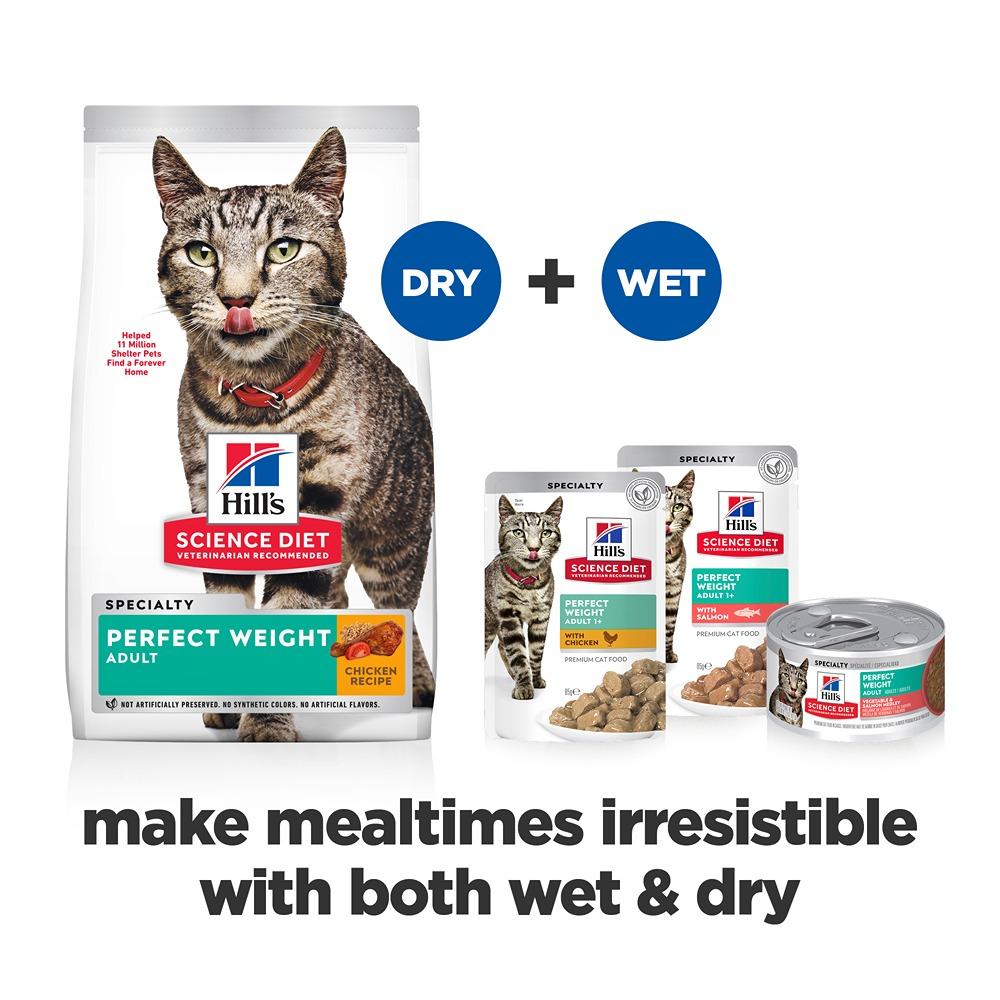 If you're looking for a breakthrough weight management cat food your pet will love, you'll want to try Hill's Science Diet Adult Perfect Weight Vegetable & Salmon Medley. Formulated for long-lasting weight support, this adult wet cat food made with natural ingredients has been clinically proven to deliver results. Over 70% of cats tested with this premium cat food lost weight within 10 weeks (research on file, Hill’s Pet Nutrition, 2011). High-quality protein helps your grown cat maintain lean muscle, while the rich salmon flavour in a mouthwatering sauce makes this an adult cat food your pet is sure to love and benefit from.