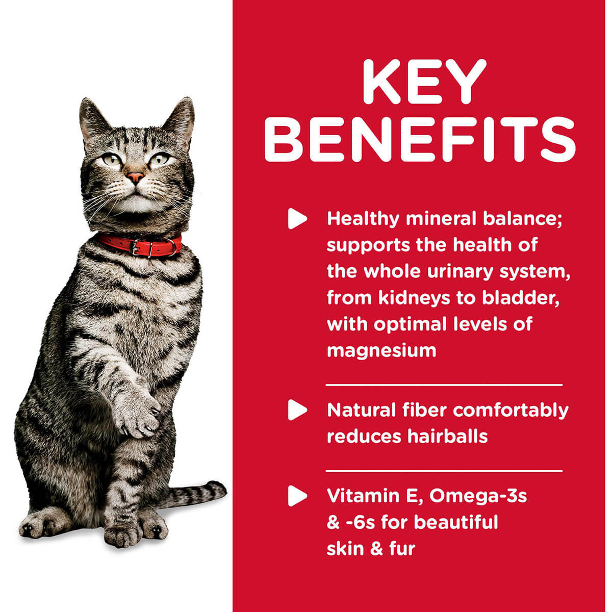 Hill's Science Diet Adult Urinary Hairball Control Chicken Entrée provides precisely balanced nutrition to help support the health of the whole urinary system while also helping to avoid hairballs. Supports the health of the whole urinary system with optimal level of magnesium. Natural fibre comfortably reduces hairballs