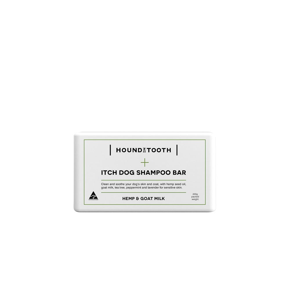 Discover Houndztooth's Hemp & Goat Milk Itchy Dog Shampoo Bar, a natural solution to clean and soothe your dog's sensitive skin and coat. Formulated with hemp seed oil, goat milk, tea tree, peppermint, and lavender, this shampoo bar is specifically designed for sensitive skin. With the anti-inflammatory properties of hemp and the lactic acid in goat milk, it effectively cleanses and moisturises for optimal skin health. The balanced fatty acids in hemp seed oil reduce inflammation associated with common skin issues, while goat milk's essential fatty acids keep your dog's skin soft and supple.