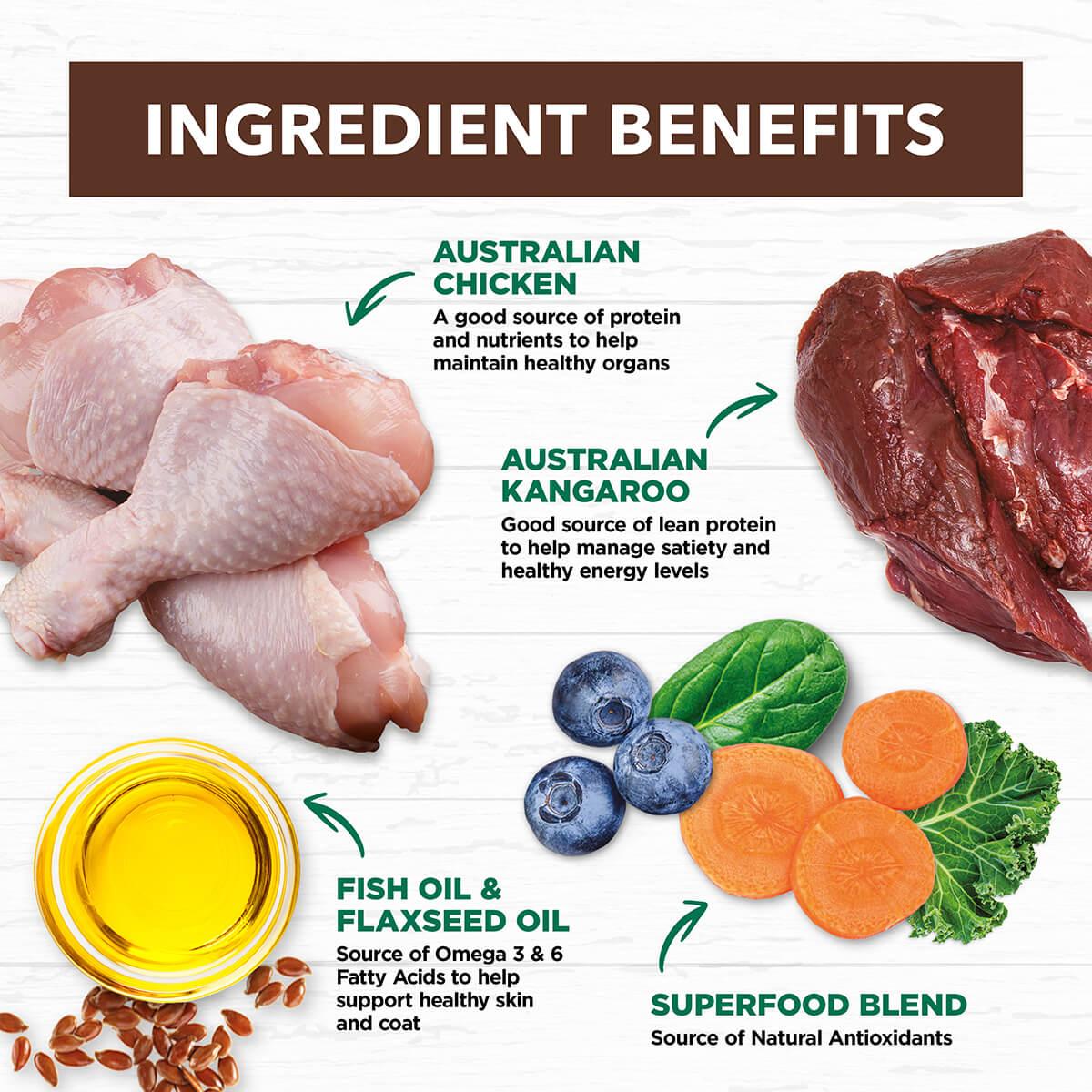 Superfoods including Blueberries and Pumpkin are added as a source of antioxidants, and fish oil and flaxseed oil deliver Omega 3 & 6 to help support healthy skin & coat.
