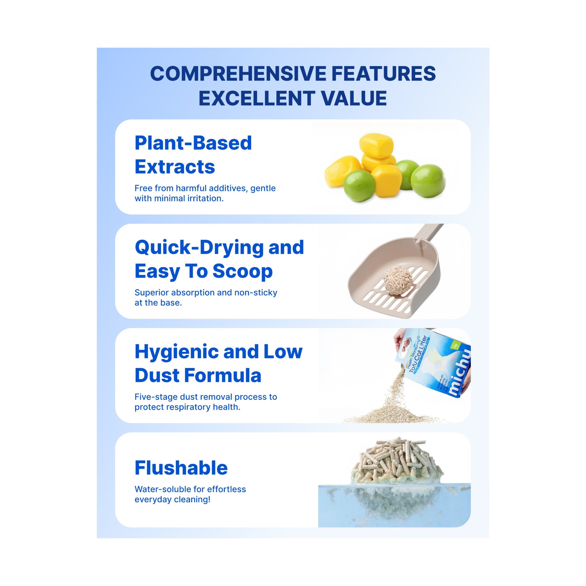 Made from high-quality natural tofu fibre, this litter absorbs moisture in seconds and forms tight, easy-to-scoop clumps for quick clean-up. Its lightweight, 99.9% dust-free texture is gentle on paws and minimises tracking, making it ideal for sensitive cats or multi-cat homes. Completely free from chemicals and fragrances, it’s a safe, hypoallergenic solution that neutralises odours naturally with soy-based deodorising power — keeping your litter box fresher for longer.
