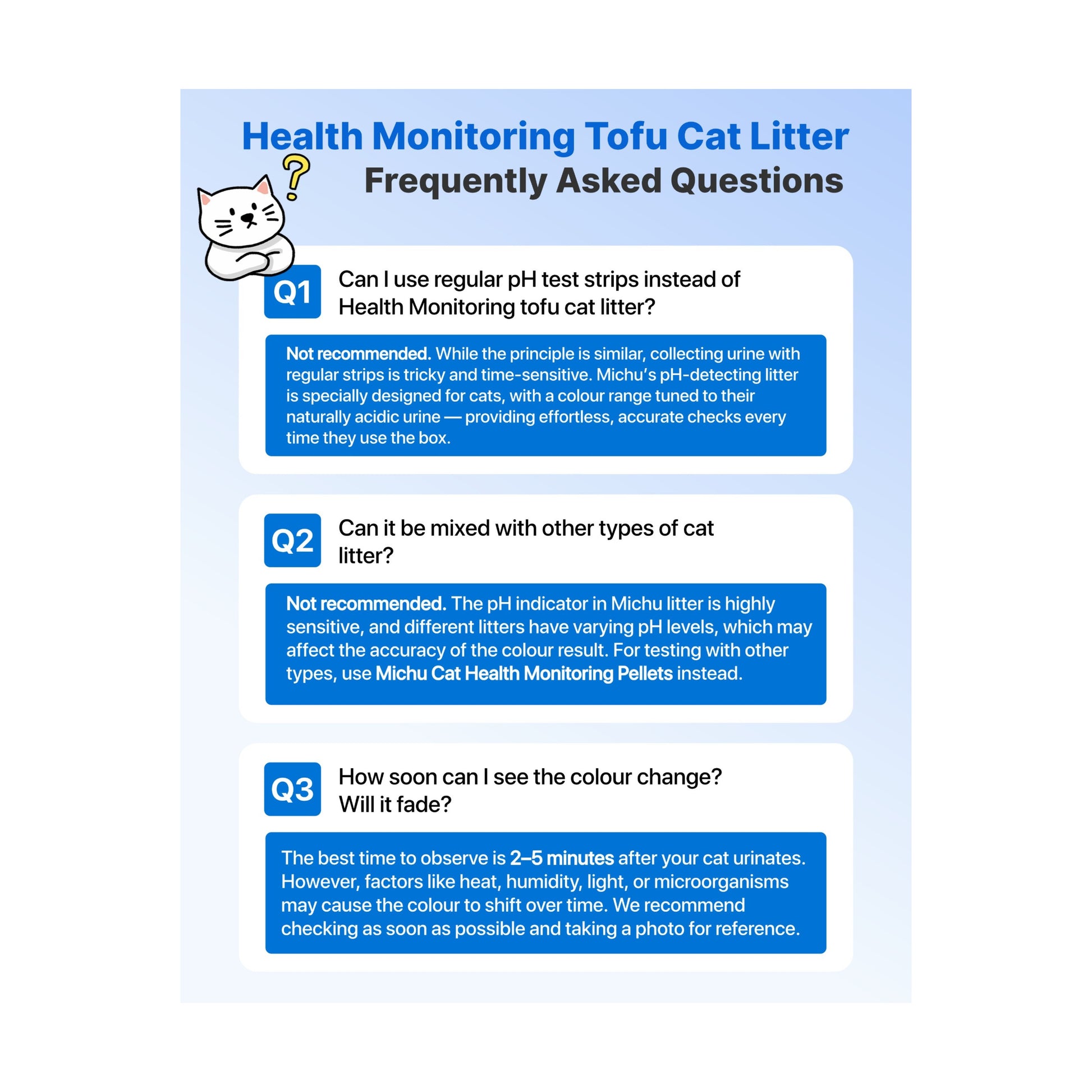 Michu Health Monitoring Tofu Cat Litter is a premium, plant-based litter designed to keep your cat’s space clean while helping you monitor their health. Perfect for both adult cats and kittens, this innovative litter features a built-in pH indicator that changes colour in response to irregular urine levels — an early warning system for potential urinary tract issues or imbalances. It’s the perfect choice for health-conscious cat owners who want peace of mind and a fresher, safer home environment.