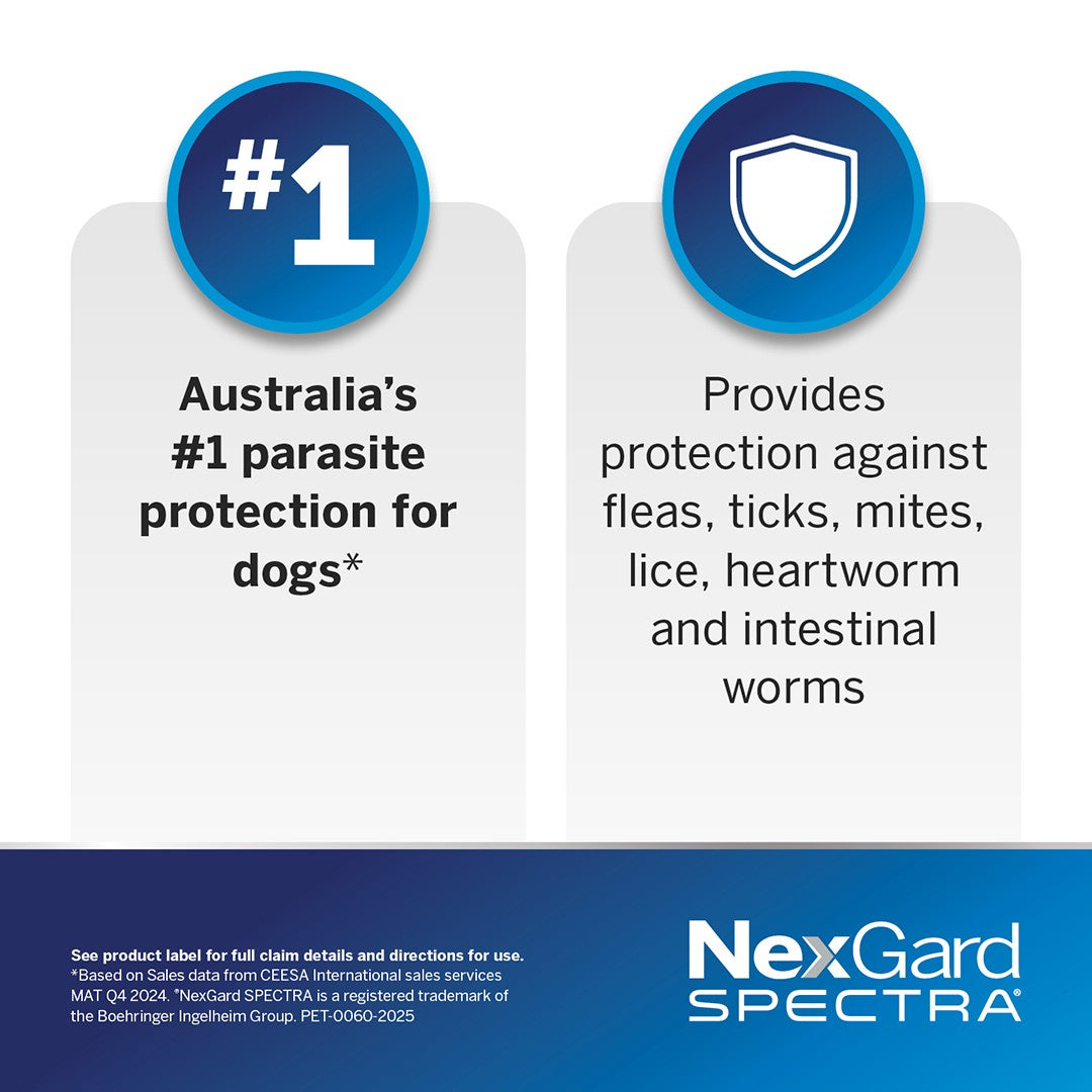 This advanced formula is highly effective against the deadly paralysis tick and rapidly eliminates fleas for 35 days to break their life cycle and protect your home. It also serves as a vital safeguard for your family by controlling intestinal worms that can be transmitted to humans. Safe for puppies from eight weeks of age and suitable for breeding, pregnant, or lactating dogs, NexGard SPECTRA is an oral treatment that remains fully effective even if your dog goes swimming or is shampooed.