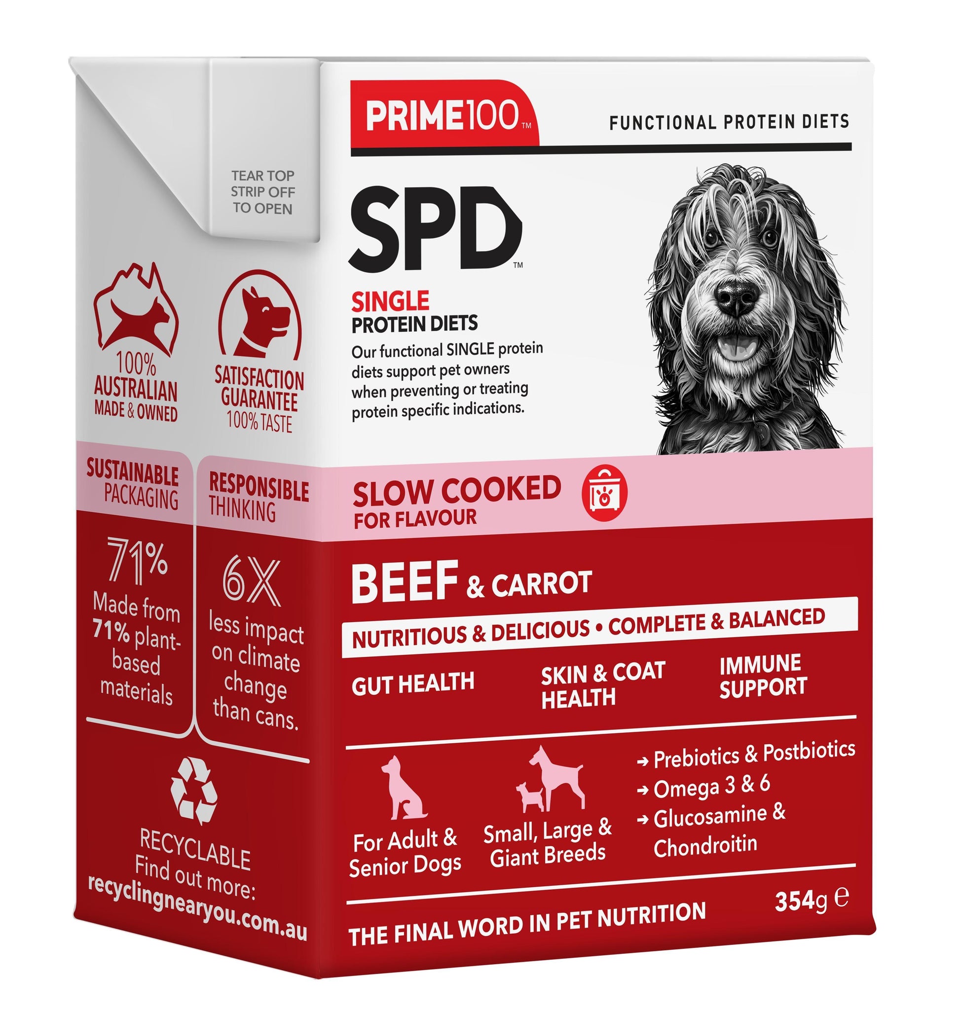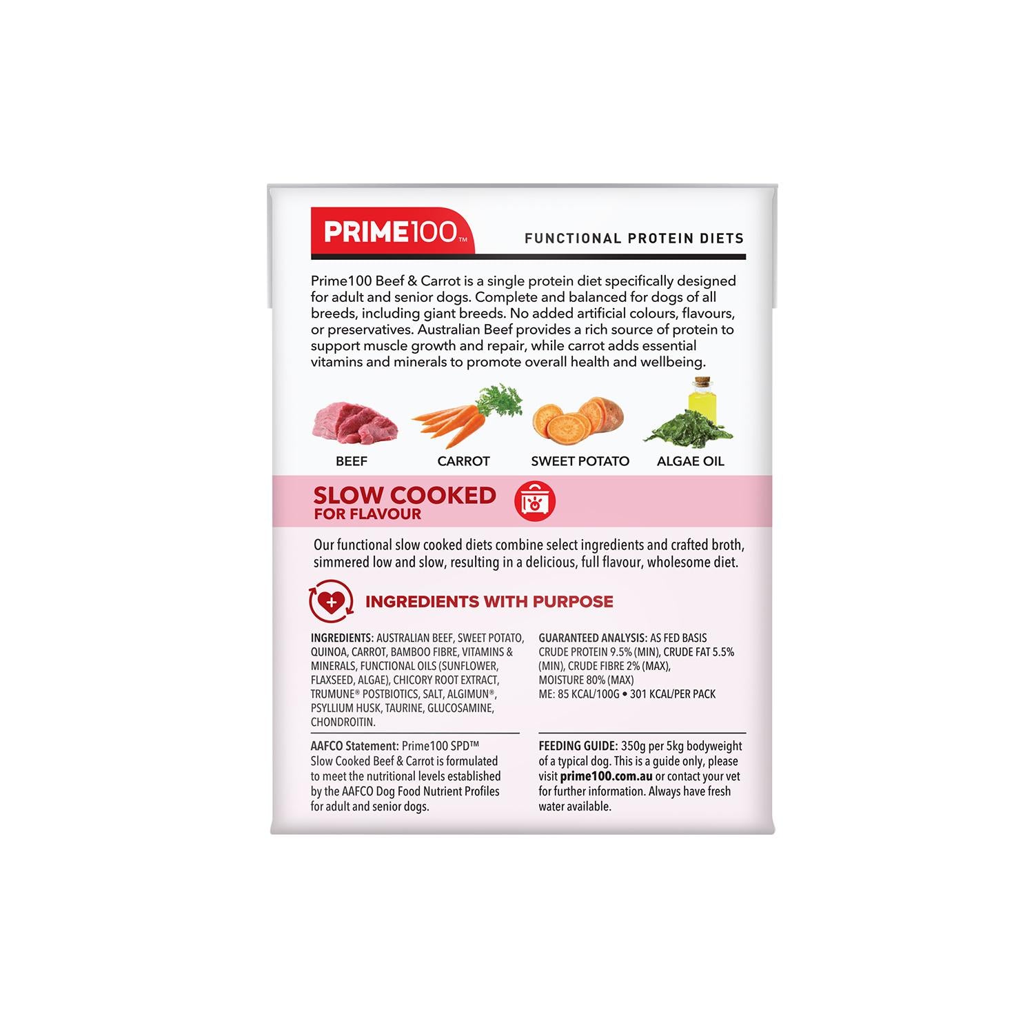 Prime100 Beef & Carrot is a single protein diet specifically designed for adult and senior dogs. Complete and balanced for dogs of all breeds, including giant breeds. No added artificial colours, flavours, or preservatives. Australian Beef provides a rich source of protein to support muscle growth and repair, while carrot adds essential vitamins and minerals to promote overall health and wellbeing.