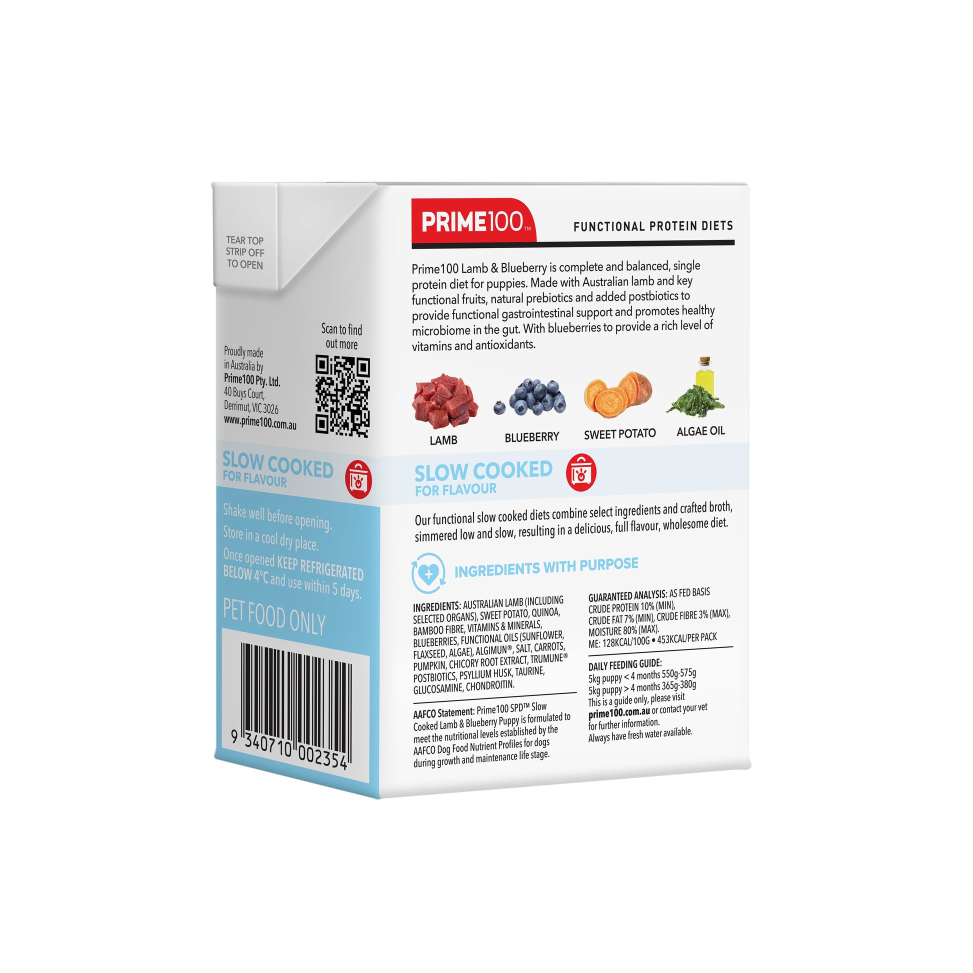 The Prime100 SPD Slow Cooked Lamb and Blueberry Puppy Wet Dog Food is a complete and balanced single-protein diet, specially formulated for growing puppies. Using Australian lamb as the sole protein source, this recipe is crafted to support healthy development while being gentle on sensitive stomachs. It’s a great choice for pet parents seeking a natural, slow-cooked meal that supports digestion, immunity, and overall wellbeing.