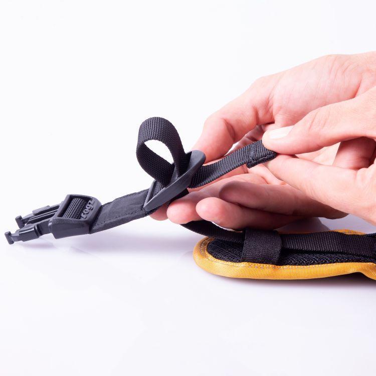 To reset the emergency safety release: feed the black webbing back through the belay loop.