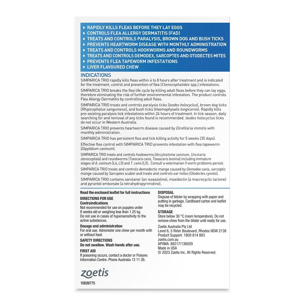 Simparica Trio Medium Breed 10.1-20kg Flea, Tick & Worming Dog Chews