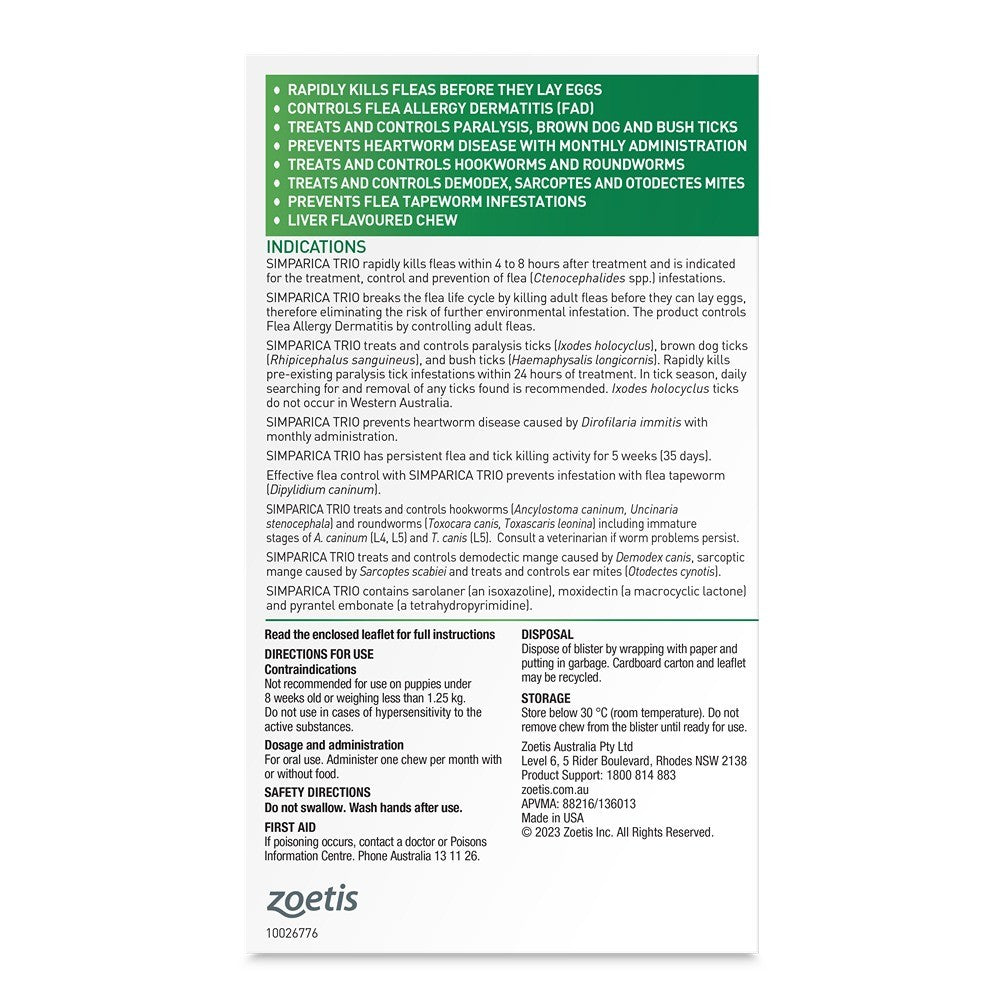 Simparica Trio is the all-in-one protector against pests and parasites, crafted for dogs weighing between 20.1 and 40.0kg. This monthly liver-flavoured chew shields your dog from fleas, ticks, heartworm, and intestinal worms, with added consideration for tapeworms and mites.