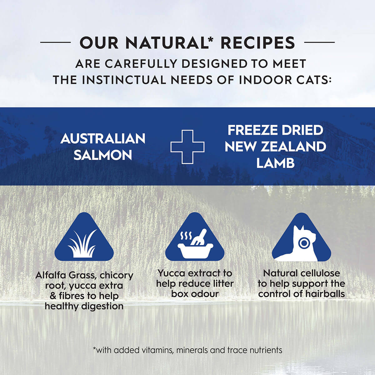 Crafted to meet your cat’s instinctual nutritional needs, this delicious premium kibble is made with delicious Australian Salmon and freeze dried lamb pieces for texture variety. Contains natural cellulose to help support the control of hairballs and Yucca Extract to reduce litter box odour.