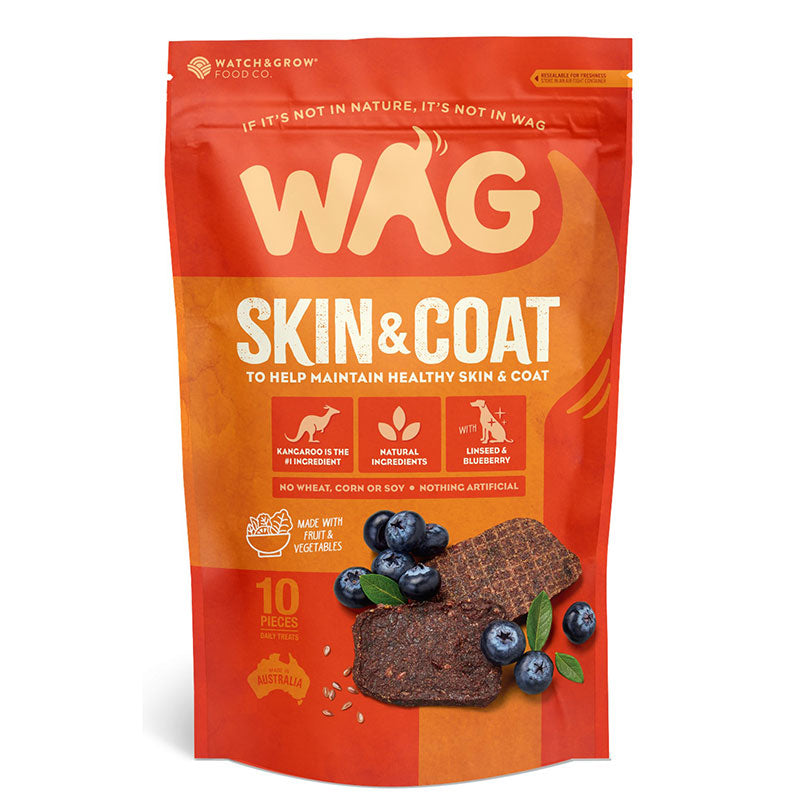 Loaded with antioxidants to help promote healthy skin and coat + NO more bad hair days! WAG Skin & Coat Jerky is made with tasty Kangaroo and naturally enriching whole foods that help support soft, shiny coats and healthy skin.