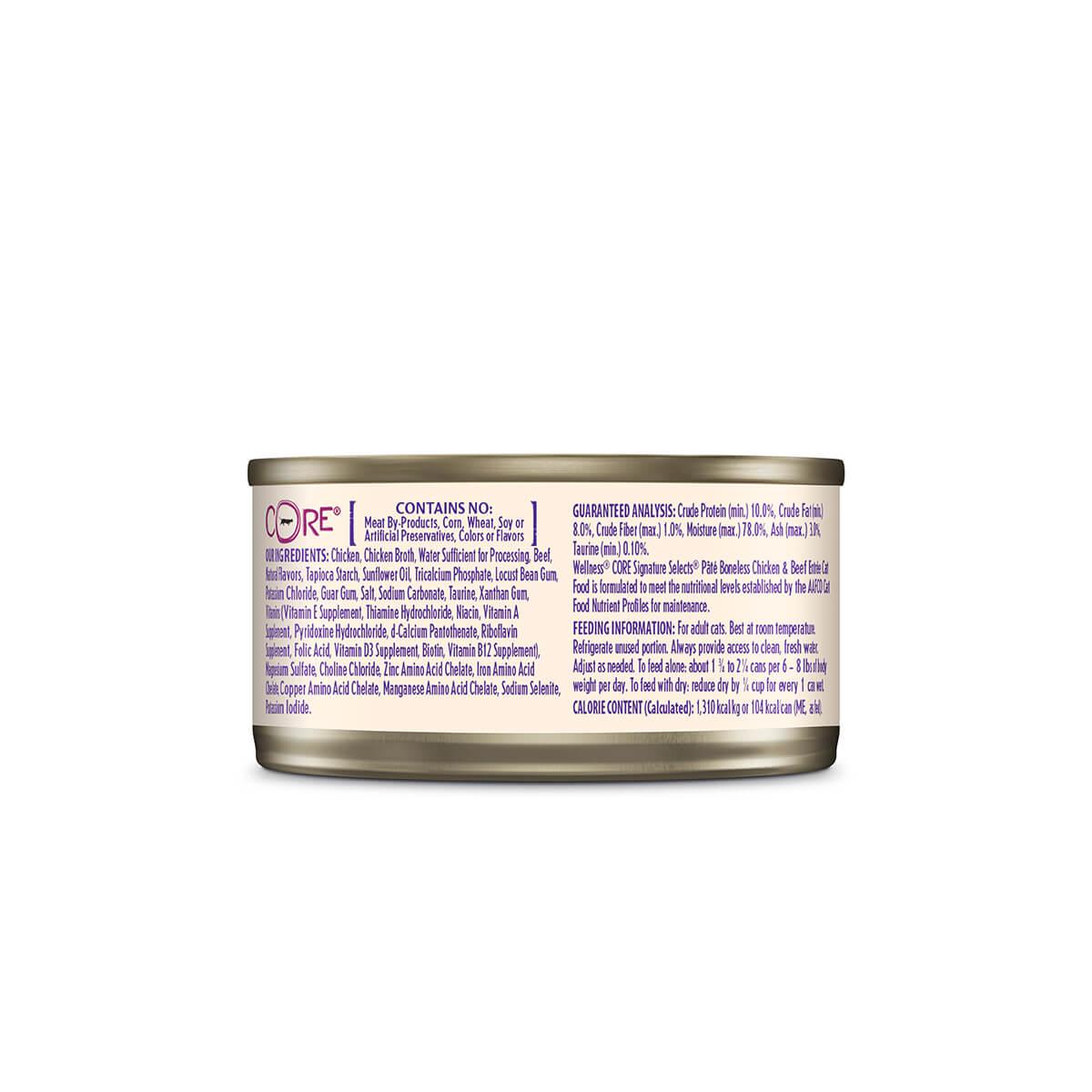 Wellness CORE is based on the nutritional philosophy that cats, given their primal ancestry, thrive on a diet mainly comprised of meat. CORE Signature Selects gourmet canned wet cat food naturally delivers the variety your cat craves from a selection of 8 different recipes to choose from. Each grain-free recipe features delicate cuts of high-quality meat or seafood in delicious sauces. CORE Signature Selects recipes are hand packed with real meat shreds and provide the daily nutrition and hydration your cat needs to thrive. Each recipe combines carefully sourced ingredients to deliver the energy and nutrition your cat needs for a happy life and never contains any by-products, wheat, corn, or soy.